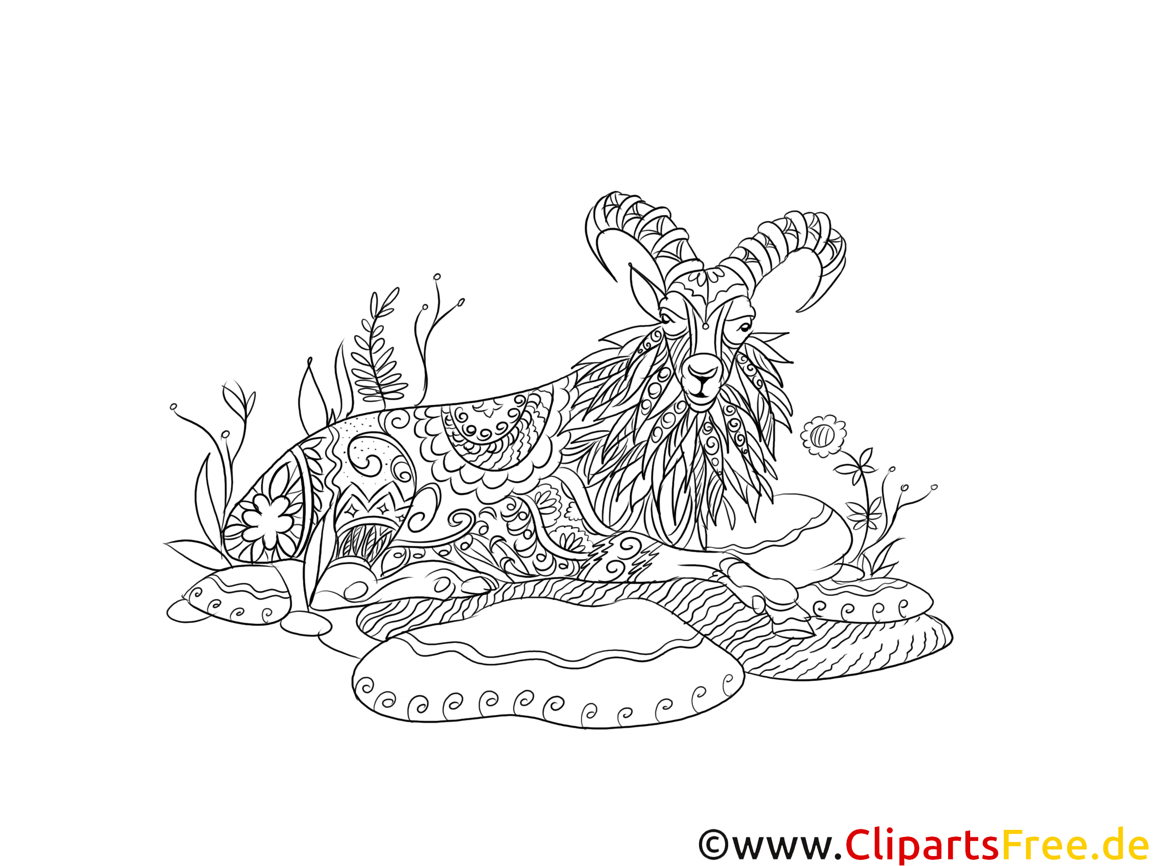 Dieses tolle Ausmalbild zeigt ein majestätisches Tier, das ganz entspannt auf einem großen Stein liegt. Ganz klar, ein unglaublich hübscher Steinbock mit wunderschönen, geschwungenen Hörnern! Aber das Beste ist eigentlich die detaillierte Verzierung. Auf seinem Körper haben sich ganz viele, verschiedene Muster und Pflanzen versteckt. Da gibt es Blumen, Blätter und sogar ein paar kleine geheimnisvolle Details, die darauf warten, coloriert zu werden. Um ihn herum wachsen dichte Gräser und weitere Pflanzen. Man könnte fast denken, es sei eine greifbare, lebendige Szene!