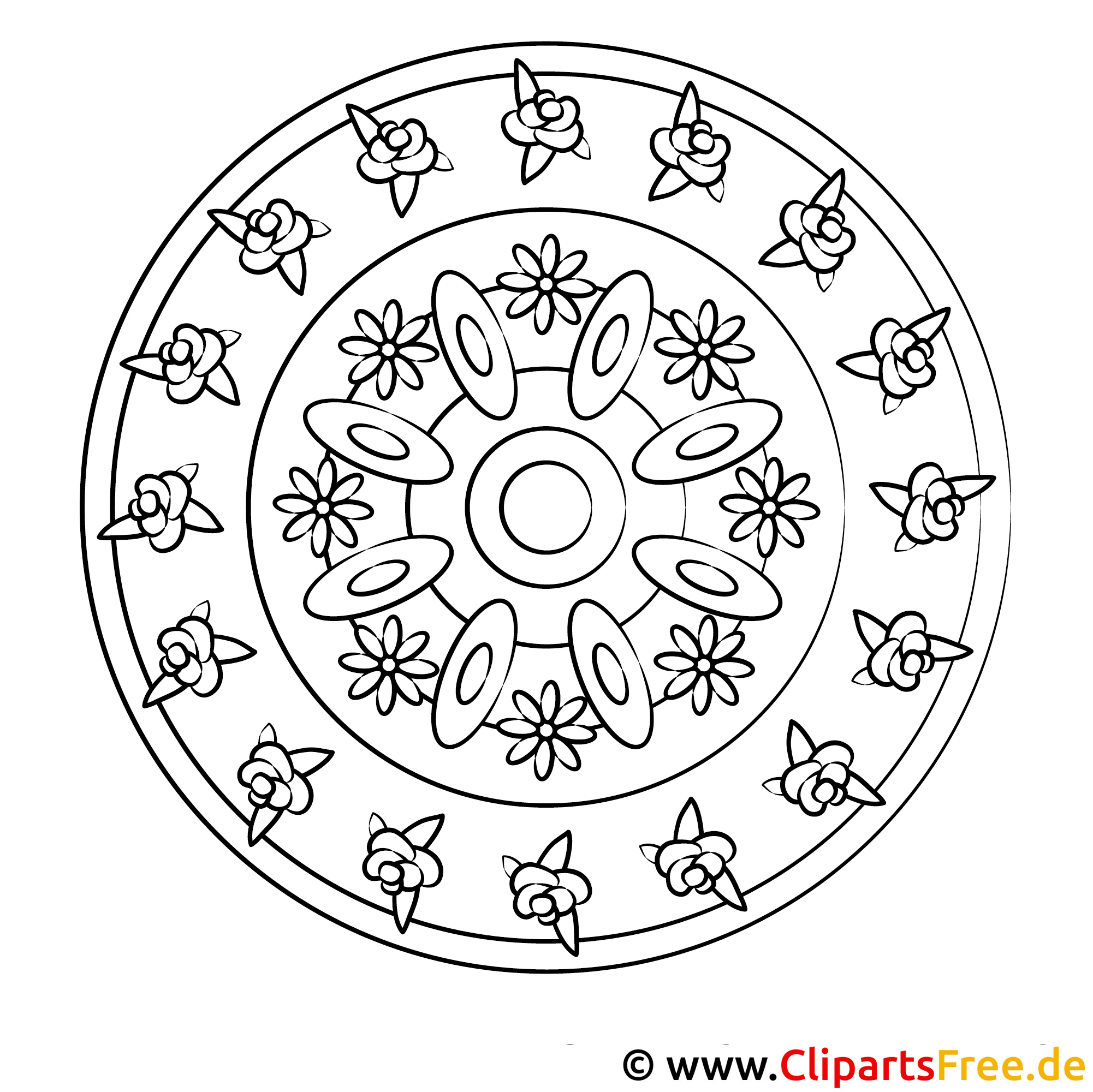 Das Ausmalbild zeigt ein wunderschönes, rundes Mandala-Muster. In der Mitte prangt ein großer Kreis, umgeben von weiteren zarten Blumen und dekorativen Elementen, die harmonisch angeordnet sind. Die kleinen Rosen und verspielten Blumen bringen Frühlingsgefühle in jedes Kinderzimmer. Übrigens, die runden Formen und klaren Linien laden regelrecht dazu ein, mit Farben kreativ zu werden. Man könnte denken: Das wird ein Fest fürs Auge!