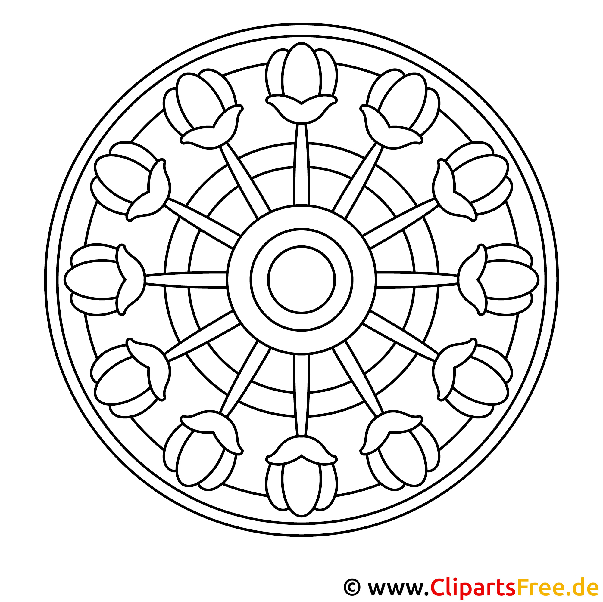 Das Ausmalbild zeigt ein wunderschönes, rundes Muster. In der Mitte prangt ein großer Kreis, der von zarten, tulpenähnlichen Motiven umgeben ist. Diese Blumen sind so angeordnet, dass sie eine harmonische Symmetrie darstellen. Man sieht schön die Blütenblätter, die nach außen zeigen, sozusagen eine kleine Frühlingsfeier auf Papier. hm, Das gesamte Bild wirkt fröhlich und einladend, perfekt für kreative Köpfe, die mit Farben spielen wollen.