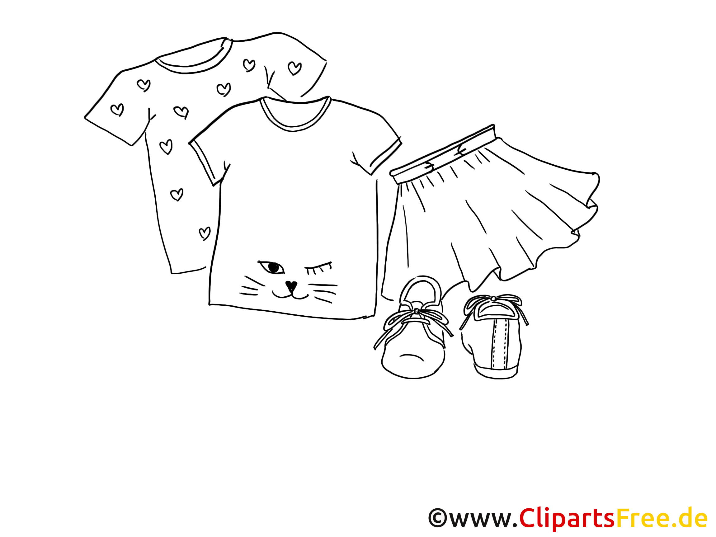 Das Ausmalbild zeigt eine witzige Zusammenstellung von Kleidungstücken für Kinder. Ehrlich gesagt, das T-Shirt mit Herzen wirkt super süß und hat diesen charmanten, fröhlichen Touch. Und dann ist da noch das andere Shirt, das, ach, einen kleinen Katzenkopf hat, der mit einem Augenzwinkern, na ja, förmlich nach Aufmerksamkeit schreit! Die kleine, flatternde Rockform macht so viel Spaß und bringt etwas Bewegung ins Bild. Schließlich sehen wir die adorablen Schuhe, die vielleicht für einen kleinen Ausflug gedacht sind oder für’s Spielen. naja, Das gesamte Bild ist eine tolle Vorlage für jeden, der seine kreative Ader ausleben möchte.