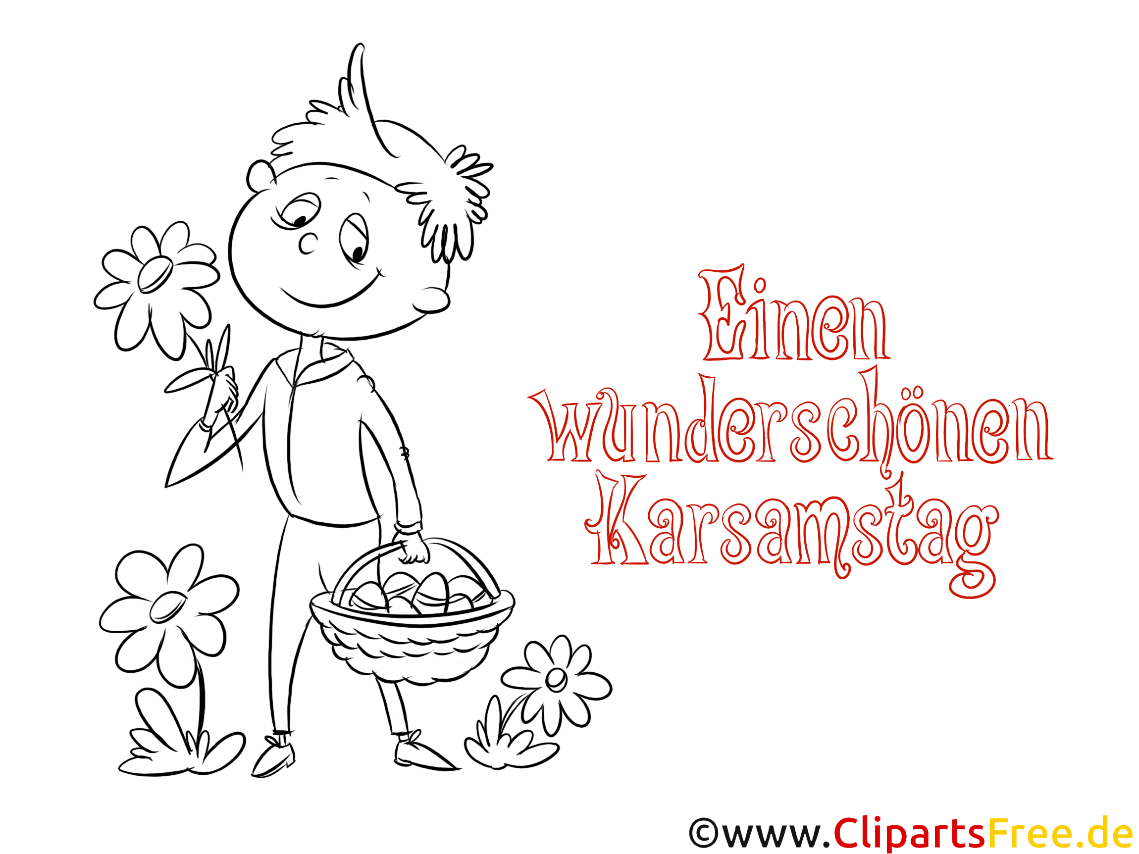 Hier haben wir ein wirklich fröhliches Bild. Ein kleiner Junge mit einem strahlenden Lächeln hält eine Blumenstaude in der Hand. Er trägt einen kleinen Korb voller bunter Eier, und um ihn herum wachsen fröhliche, große Blumen. Außerdem schon mal ganz praktisch: Oben steht in verspielter Schrift „Einen wunderschönen Karsamstag“. Apropos Karsamstag, das Bild fängt wirklich die Freude und die Stimmung von Frühling und Ostern ein, nicht wahr? Perfekt zum Ausmalen!