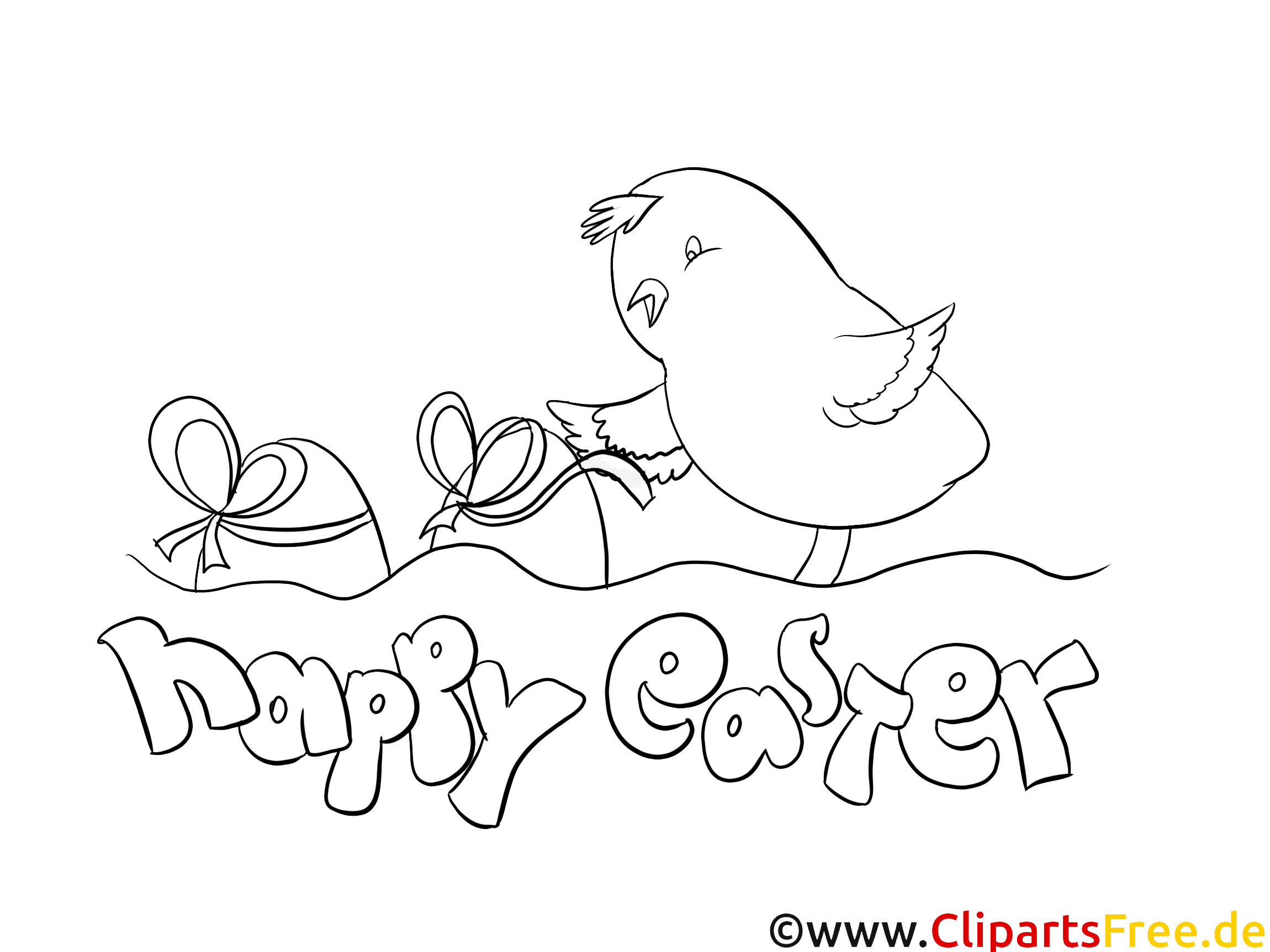 Hier haben wir ein fröhliches Motiv, das ein süßes Küken zeigt, das ganz neugierig um einige Ostergeschenke herumtollt. Die Geschenke sind hübsch mit Schleifen verziert. Neben den Geschenken steht in großen, kindlichen Buchstaben „Happy Easter“. Das Bild strahlt eine fröhliche Atmosphäre aus und weckt sofort die Vorfreude auf das Osterfest. Es lädt dazu ein, kreativ zu werden und dieses tolle Motiv auszumalen. Das Bild passt perfekt zur fröhlichen Frühlingszeit.