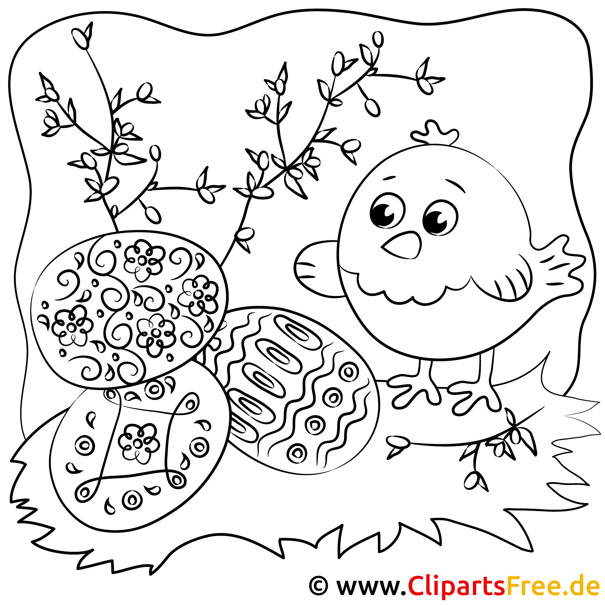 Kostenloses Ausmalbild Küken mit bunten Ostereiern im PDF