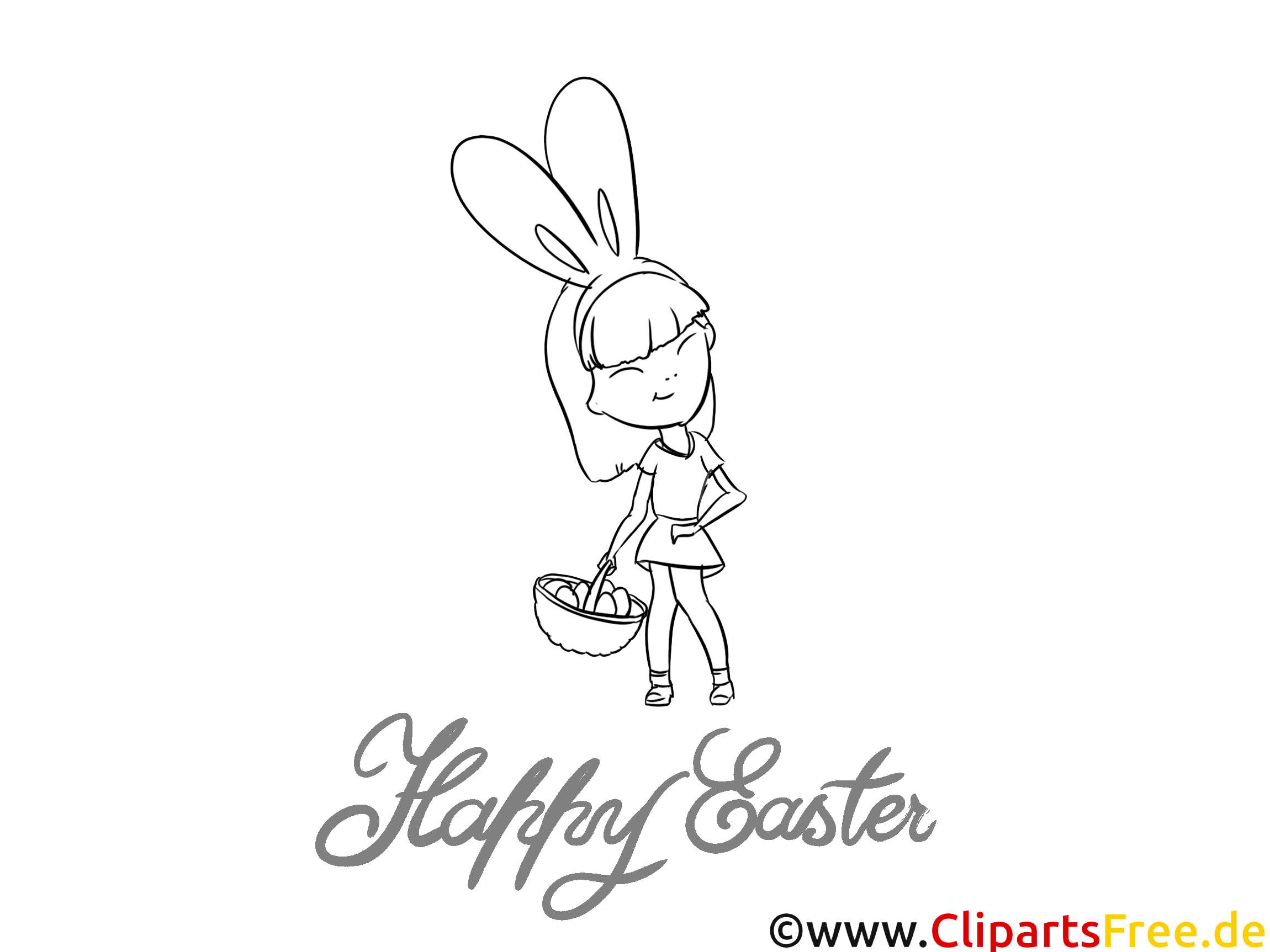 Hier sehen wir ein fröhliches kleines Mädchen mit einem Korb in der Hand, das vor Freude strahlt. Sie trägt große Hasenohren – ist das nicht süß? Das Bild strahlt echte Osterstimmung aus, mit bunten Eiern in ihrem Korb, die förmlich nach Farbe und kreativen Ideen rufen. Der Schriftzug „Happy Easter“ darunter rundet das Motiv ab und bringt alle in die richtige Laune, um das Fest zu feiern. Was für eine tolle Malvorlage, oder?