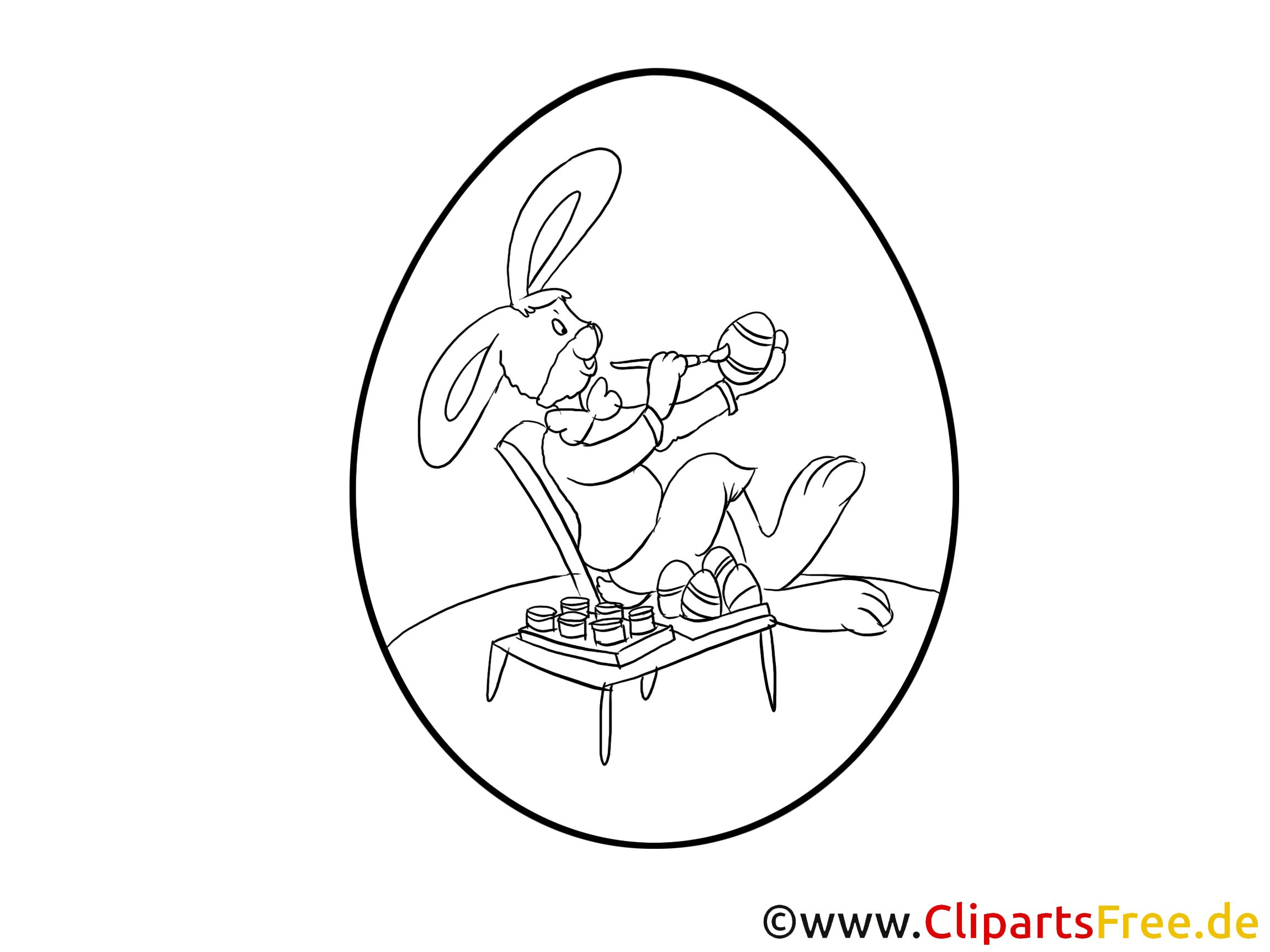 In dieser charmanten Ausmalvorlage sieht man einen putzigen Hasen, der entspannt in einem Stuhl sitzt. Er hat echt einen coolen Blick auf dem Gesicht! In seinen Pfoten hält er ein buntes Ei, das darauf wartet, verschönert zu werden. Vor ihm steht ein kleiner Tisch mit Farbtöpfen. Man kann fast das Gefühl haben, dass er gerade kreativ ist und plant, das Ei bunt zu gestalten. naja, Umgeben ist er von einer ovalen Form, die wie ein riesiges Osterei wirkt. Das ist einfach perfekt für die Osterzeit!