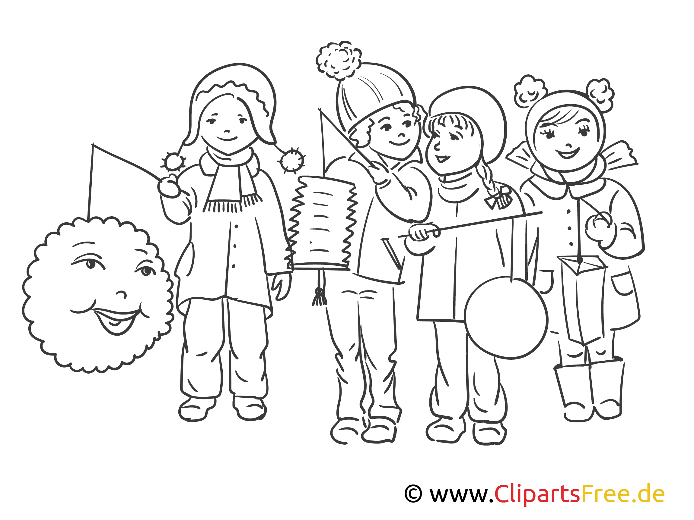 Das Ausmalbild zeigt eine fröhliche Gruppe von Kindern im Winter, die zusammen eine kleine Feier veranstalten. Mit verschieden bunten Laternen, einer Lichtern und sogar einem lustigen Mond-Gesicht, das unübersehbar den Kindern auf die Schulter schaut. Sie tragen dicken Laufjacken, schicke Hüte mit pom-poms und Schal, was sofort diese echte Winterstimmung kreiert! Man könnte fast hören, wie sie laut lachen und singen. So eine schöne, lebendige Szenerie, die die Freude und die magische Zeit des Winters perfekt einfängt.