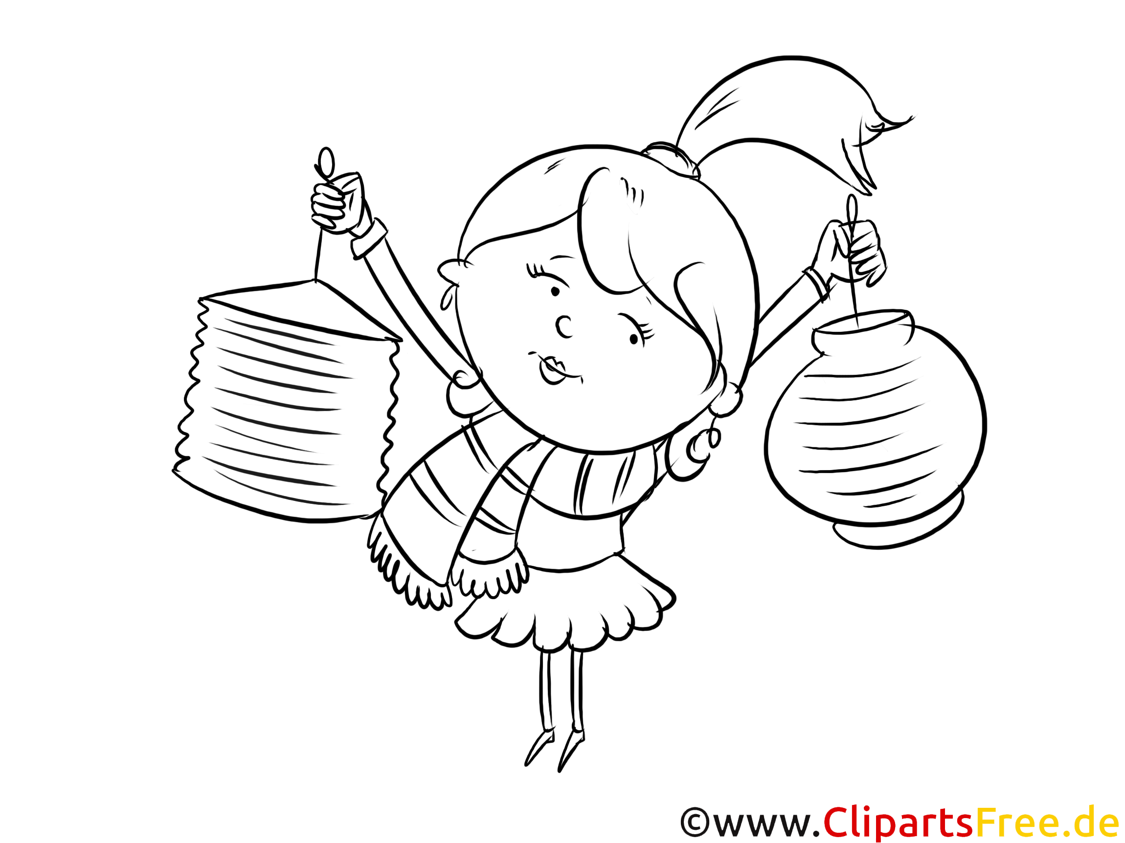 Das Bild zeigt ein fröhliches Kind, das voller Energie aussieht. Mit einem strahlenden Lächeln hebt es zwei bunte Laternen in die Luft – eine witzige Mischung aus Design und Charakter! Die eine Laterne ist rund, die andere wieder eher rechteckig, was richtig abwechslungsreich wirkt. Das Mädchen trägt einen warmen Schal und hat eine hübsche Frisur, die ein bisschen wehwindig aussieht. Ehrlich gesagt, wirkt sie so, als wäre sie direkt von einem Winterfest oder einer fröhlichen Feier gekommen. Diese Darstellung lädt dazu ein, alles in bunten Farben auszumalen!