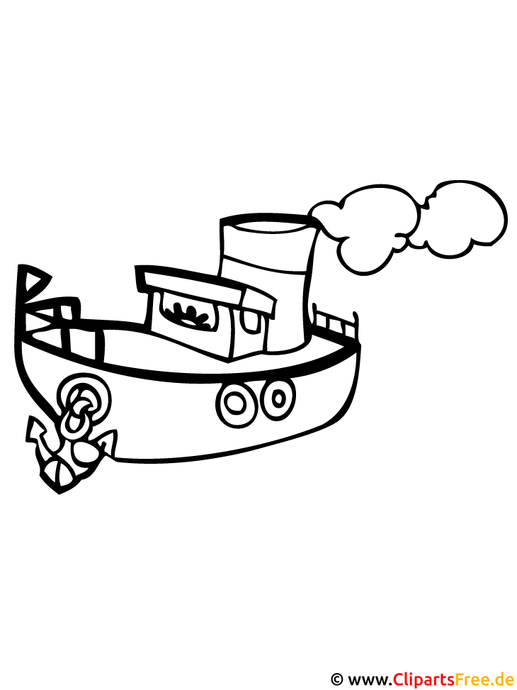 Schau mal, dieses tolle Bild zeigt ein kleines Dampfschiff! Es hat einen großen Rauchfang, aus dem lustige Wolken aufsteigen. Auf dem Schiff gibt es sogar eine kleine Flagge, die fröhlich im Wind weht. Die runden Fenster sind ein echtes Highlight – wer könnte da nicht neugierig werden, was sich wohl im Inneren abspielt? Im Vordergrund sieht man einen Anker, der dem Bild einen besonderen Charme verleiht. Einfach zum Ausmalen prima geeignet!