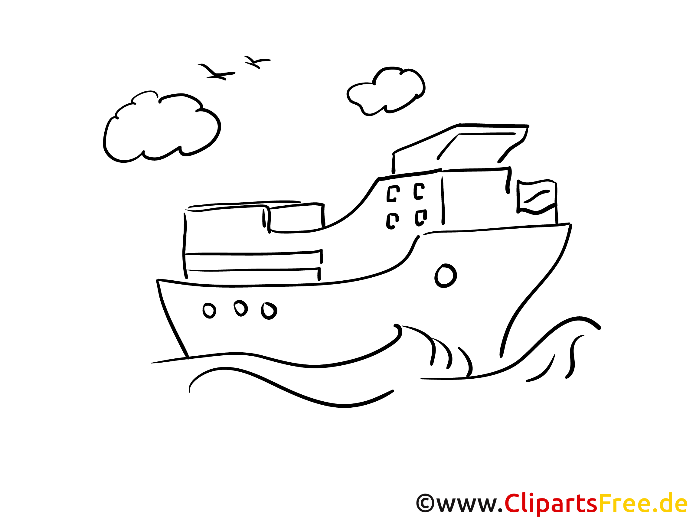 Hier haben wir ein wunderschönes Ausmalbild eines Schiffes! Das große, lässige Boot schwimmt gemächlich über die Wellen – sehr beeindruckend. Man sieht, wie die Wellen leicht an dem Schiff schaukeln und die Möwen darüber fliegen. Oben am Himmel sind ein paar Wolken, die unverkennbar die maritime Atmosphäre dieser Szene unterstreichen. Das Bild bietet viel Raum, um mit Farben zu experimentieren. Ist das Schiff blau? Oder vielleicht rot mit einer gelben Flagge? Ihr dürft da wirklich kreativ sein!