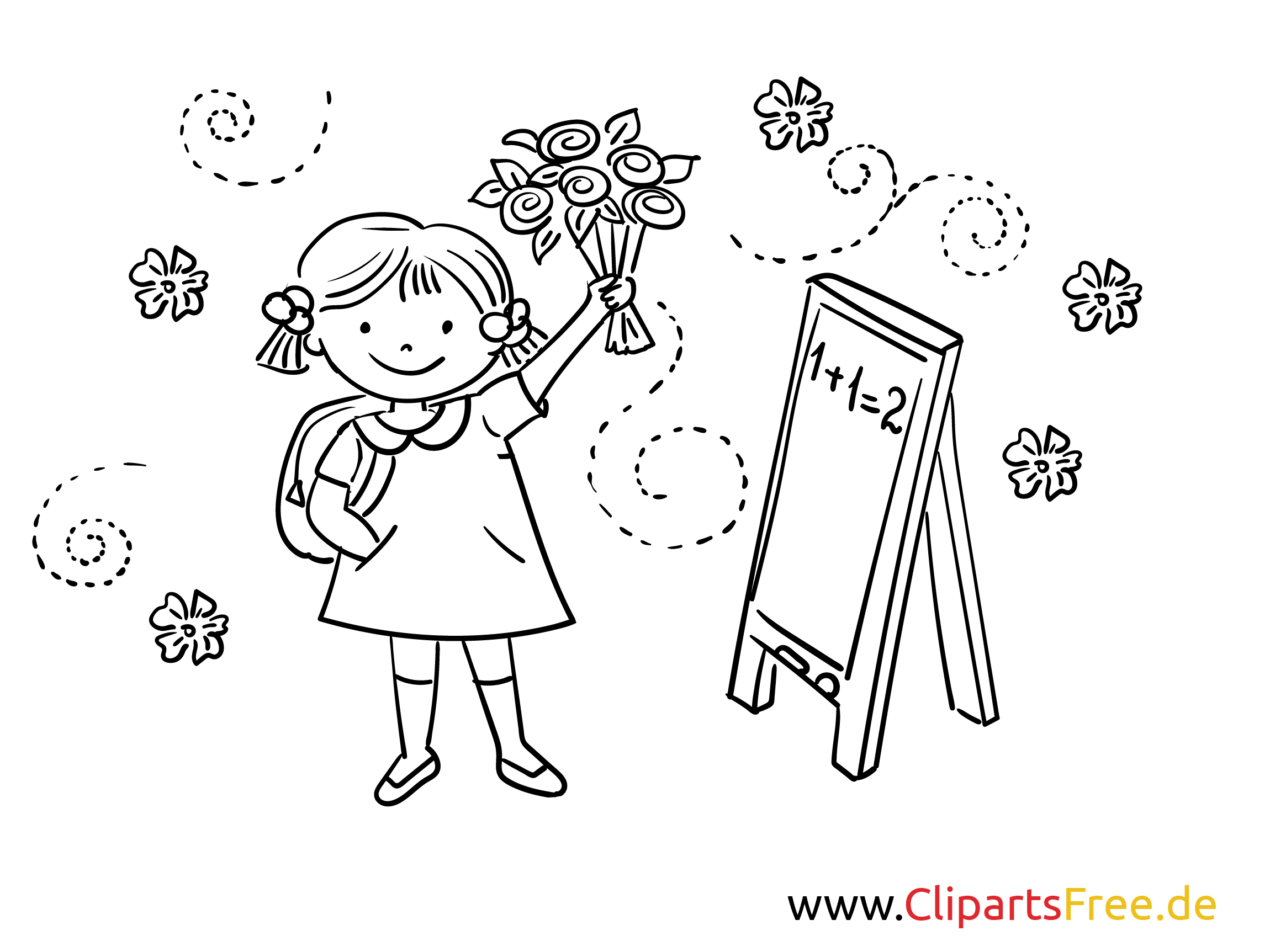Schau mal hier! Ein fröhliches Kind, das mit bunten Blumen in der Hand dasteht. Es lächelt, als ob es eine tolle Nachricht hat. Die süßen Zöpfe, die schicke Kleidung und – ach ja! – der Rucksack, der auf dem Rücken sitzt, lassen uns direkt in die Schule denken. Und das kleine Schild neben dem Mädchen zeigt eine einfache Rechnung: 1 + 1 = 2. Außerdem schweben kleine Blumen und verschnörkelte Linien um das Bild herum, was einfach zauberhaft aussieht.