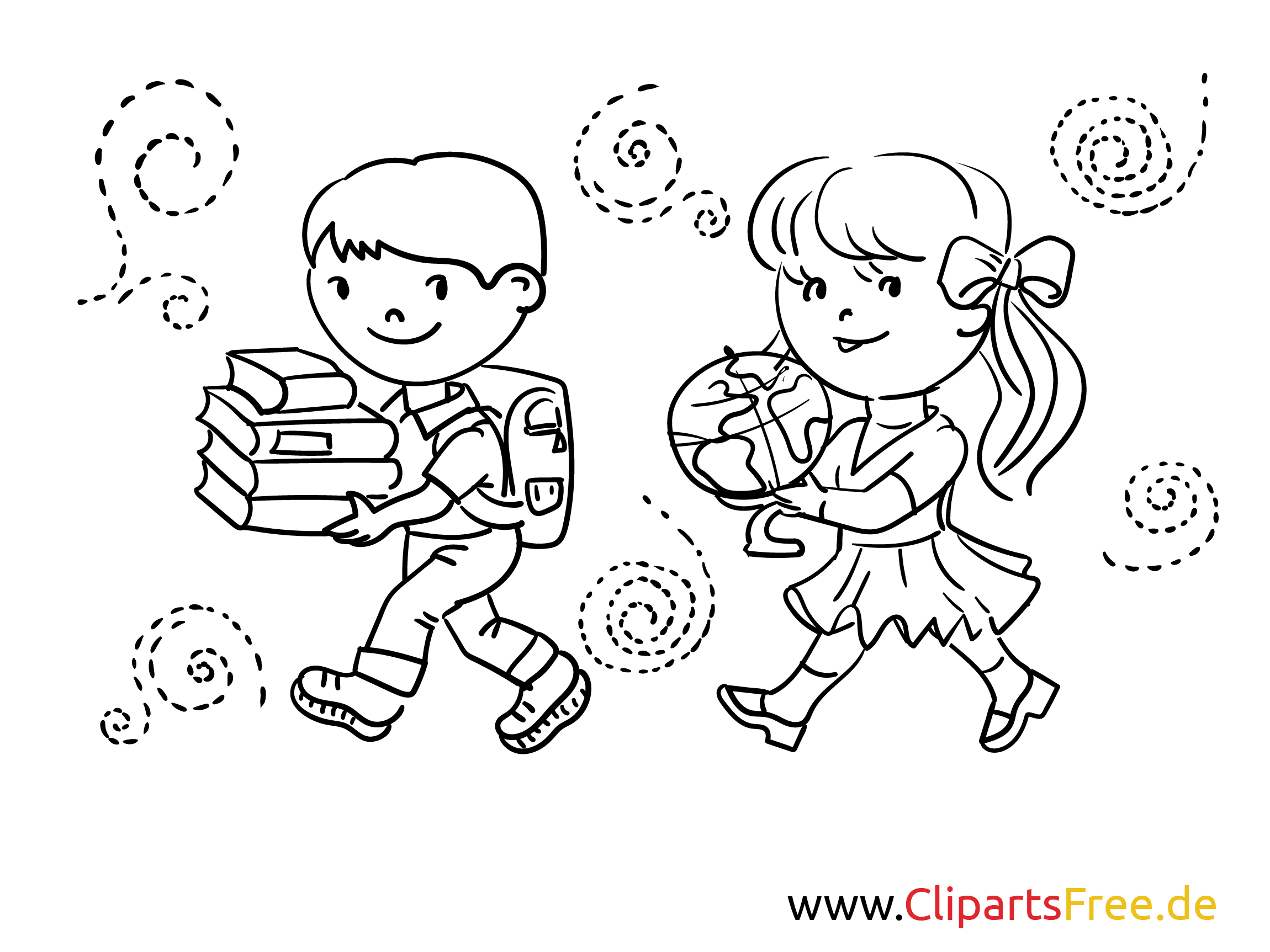 Das Bild zeigt zwei fröhliche Kinder – ganz eindeutig auf dem Weg zur Schule! Der Junge trägt einen großen Rucksack und hat in den Händen einige Bücher, die fast zu schwer für ihn erscheinen. Die kleine Mädchen an seiner Seite hält stolz einen Globus, als ob sie die ganze Welt in den Händen trägt. Um sie herum wirbeln kleine Spiralen, die eine spielerische Leichtigkeit vermitteln. Diese Skizze strahlt Freude und Abenteuerlust aus, und sie lädt echt zum Ausmalen ein!