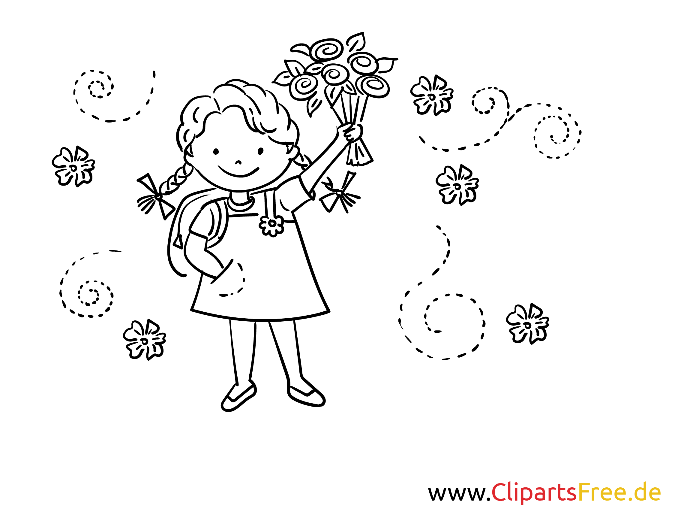 Das Bild zeigt ein fröhliches Kind, das mit einem bunten Blumenstrauß in der Hand steht. Die Haare sind in einer süßen kurzen Zopffrisur gebunden, und das Kind trägt ein einfaches, aber hübsches Kleid. Um das Kind herum flattern kleine Blumen und schwungvolle Linien, die das Bild lebendig wirken lassen. Man könnte fast glauben, dass man die Blütenblätter im Wind tanzen sieht. Das sorgt direkt für gute Laune, findest du nicht auch? Es ist eine charmante Szene, die ideal ist, um sie mit Farben zum Leben zu erwecken.
