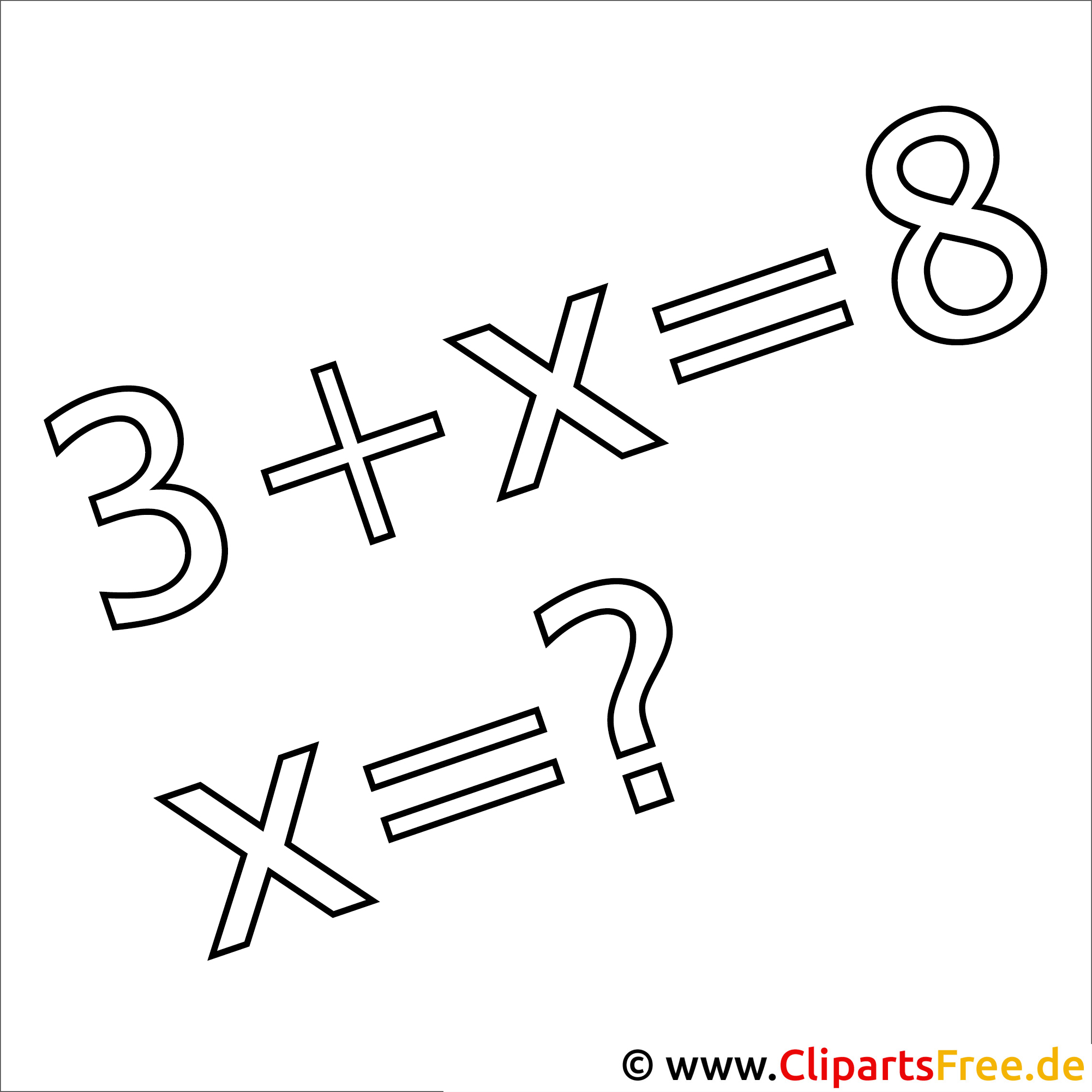 Dieses Ausmalbild zeigt eine einfache, aber spannende Mathematikaufgabe: 3 + X = 8. Das ist ein Rätsel, oder? Unten drauf steht noch: X = ? Die Zahlen und Buchstaben laden die kleinen Denker ein, in die Welt der Zahlen einzutauchen. Es gibt viel Raum für kreatives Ausmalen, egal ob man bunte Farben oder sogar Glitzerstifte nutzt. So wird Mathematik gleich viel lebendiger!