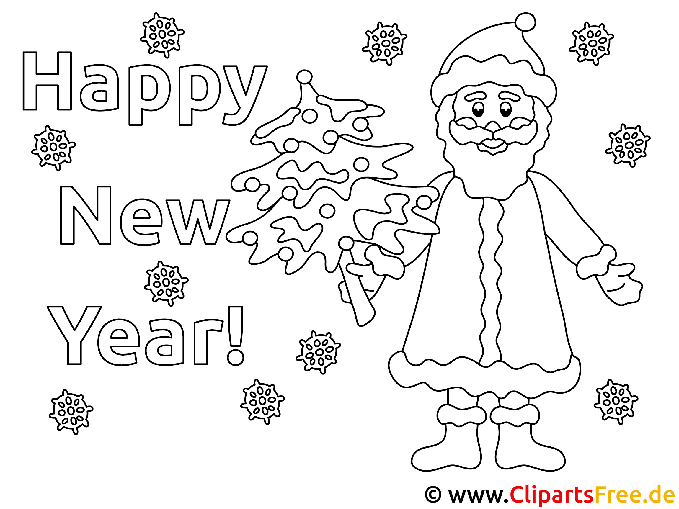 Das Ausmalbild zeigt einen fröhlichen Weihnachtsmann, der einen kleinen Weihnachtsbaum in der Hand hält. Er trägt seinen typischen roten Anzug mit weißem Pelzverbund und hat einen langen, weißen Bart. Um ihn herum schneit es, sieht man viele kleine Schneeflocken, die die winterliche Stimmung unterstreichen. Außerdem steht in großen Buchstaben „Happy New Year!“ geschrieben. irgendwie, Ein wunderbares Motiv, um die Festtagsstimmung festzuhalten!