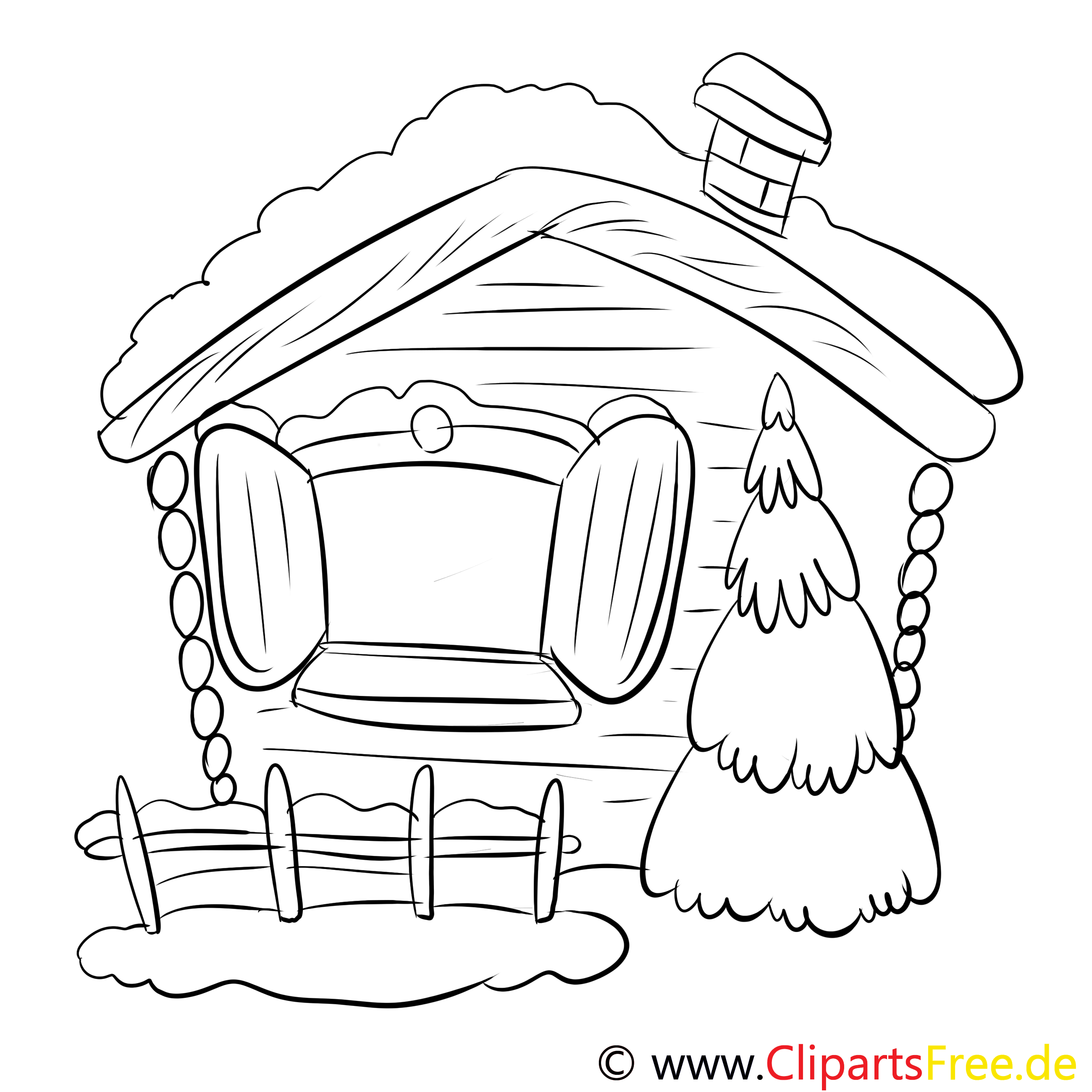 Kostenloses Ausmalbild Holzhaus im Wald als PDF Malvorlage