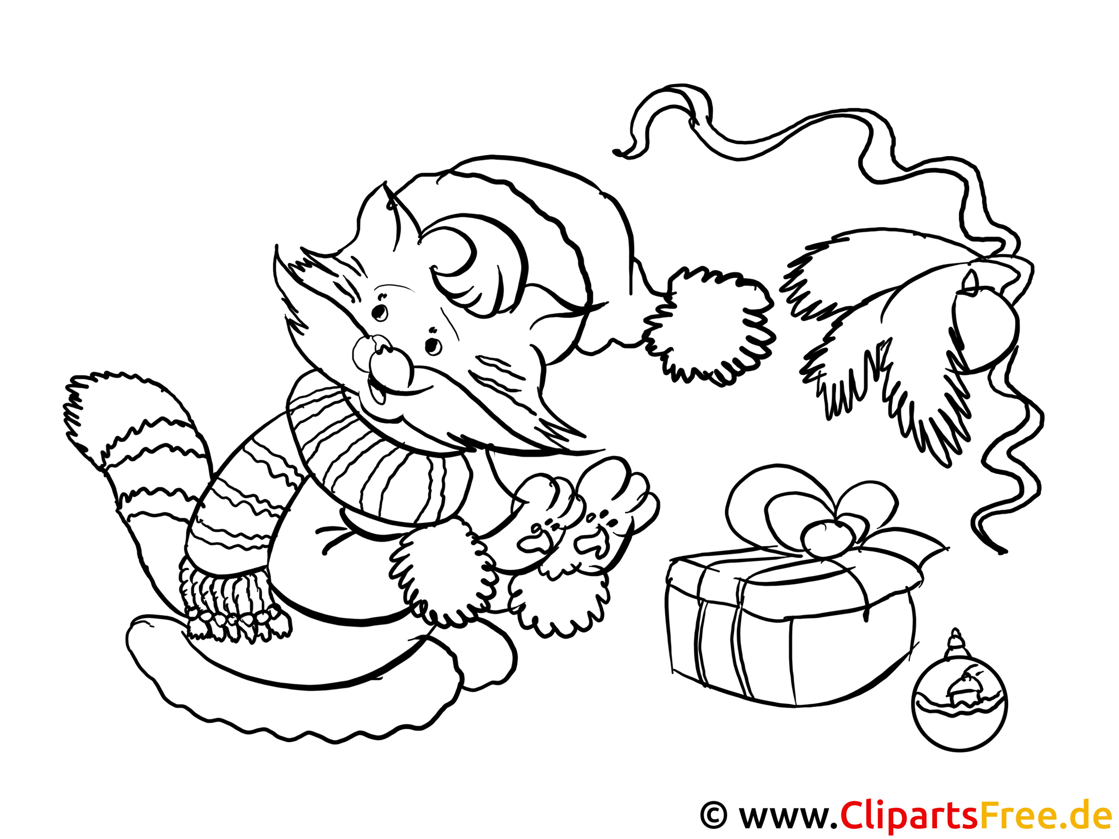 Kostenloses Ausmalbild Kater im Weihnachtslook als PDF Malvorlage