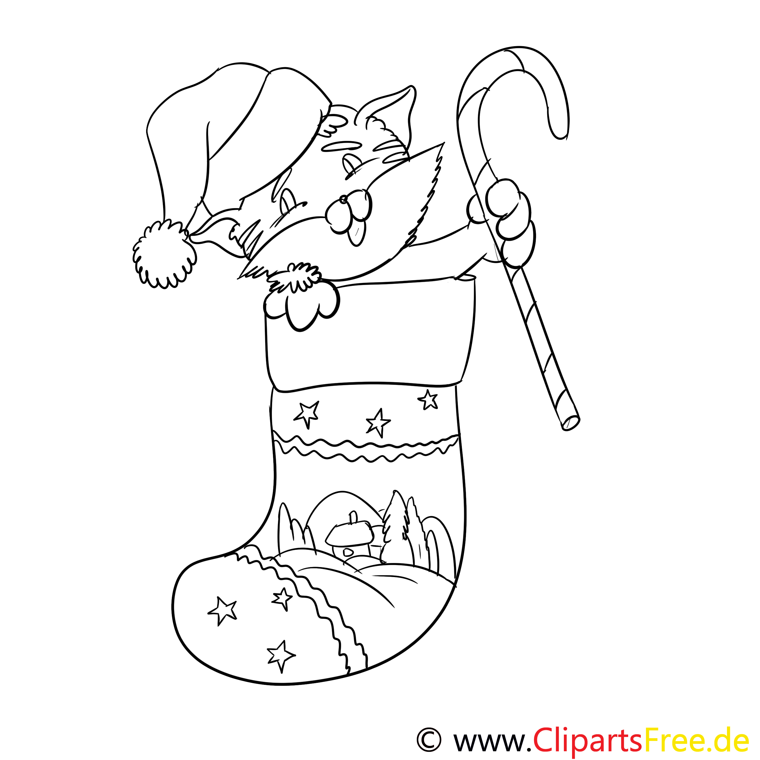 Kostenloses Ausmalbild Kater im Weihnachtsstrumpf als PDF