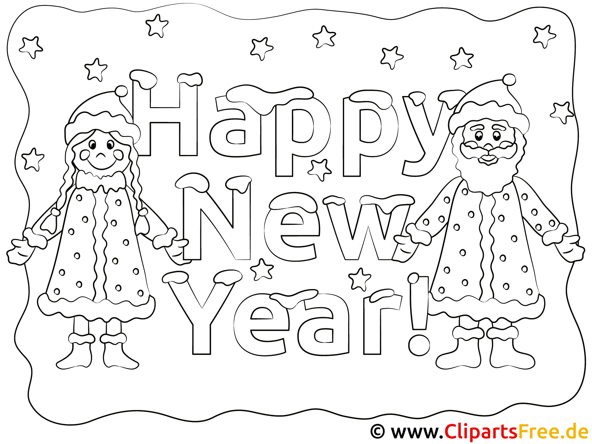 Das Ausmalbild zeigt zwei fröhliche Figuren, die einander gegenüberstehen. Seltsamerweise trägt der Mann einen dicken, weißen Bart und einen warmen Mantel, während das Mädchen eine hübsche Mütze hat. Sie sehen einfach toll aus, oder? Dazu kommt der große Schriftzug „Happy New Year!“ – das schreit nach Feier! Um die Figuren herum gibt es kleine, leuchtende Sterne und viel Platz zum Ausmalen. Das Bild eignet sich hervorragend, um die Vorfreude auf das neue Jahr festzuhalten.