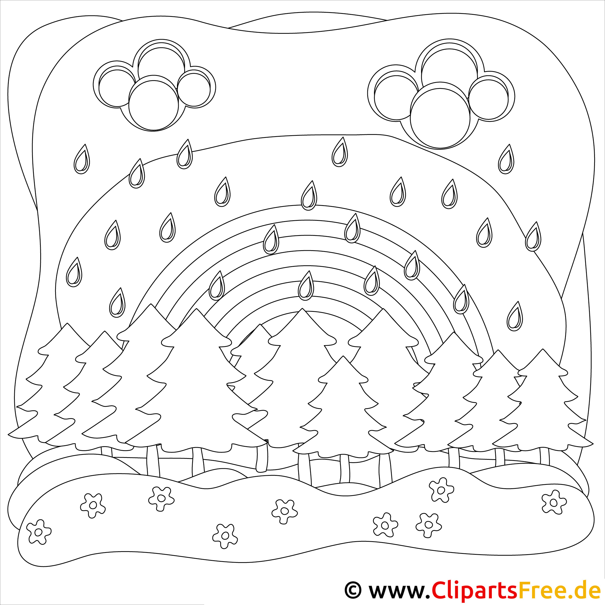 Hier haben wir ein fröhliches Ausmalbild! Ganz oben am Himmel finden sich einige flauschige Wolken. Ein bunter Regenbogen schwingt sich elegant durch die Mitte des Bildes. Darunter reihen sich freundliche, grüne Tannenbäume auf. Das Bild ist versehen mit kleinen, niedlichen Blümchen am Rand – alles zusammen ergibt eine harmonische, heitere Atmosphäre. Und übrigens, die Tropfen, die hier und da vom Himmel fallen, passen perfekt zu einem regenbogenreichen Tag.
