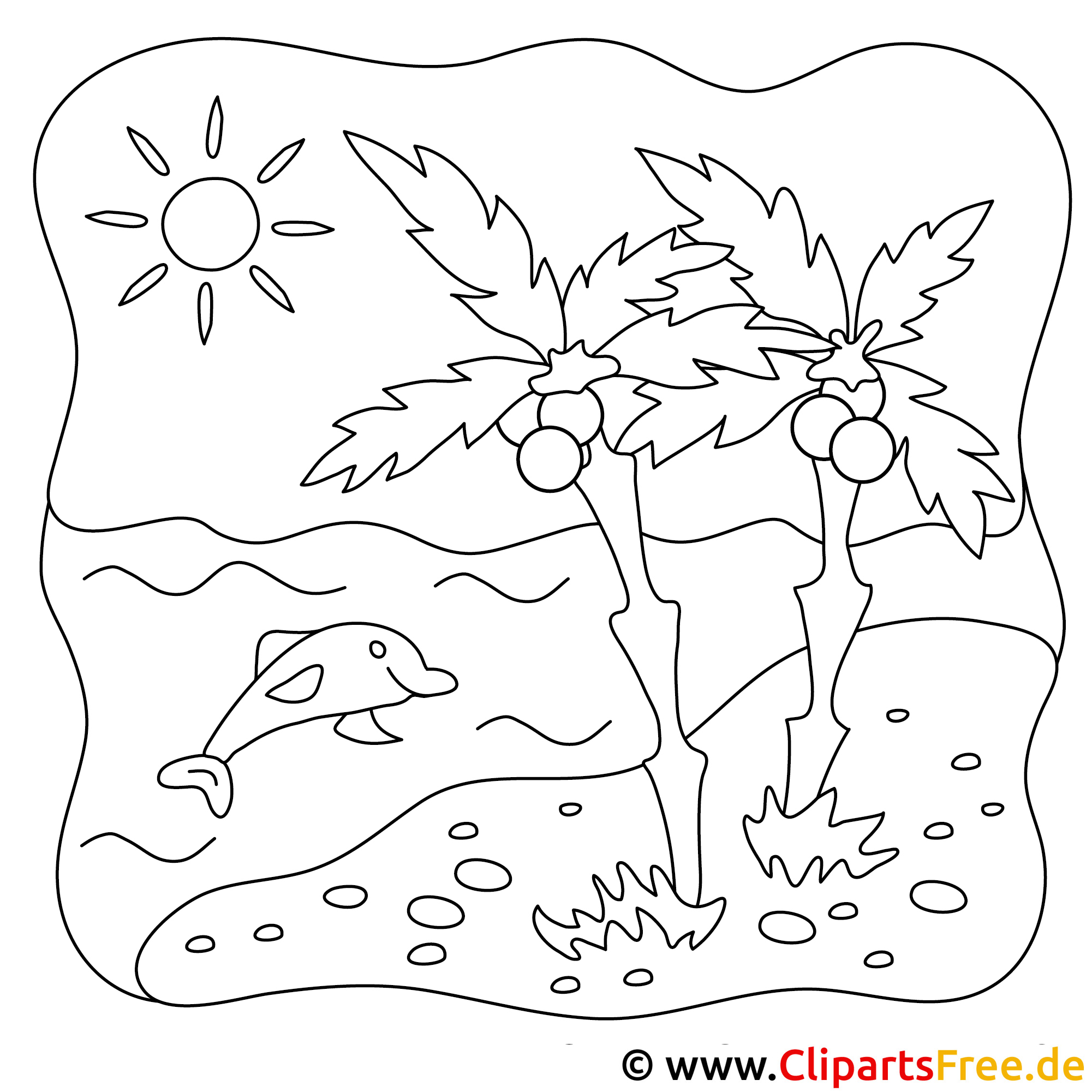 Kostenloses Ausmalbild Delfin am Strand - Malvorlage im PDF