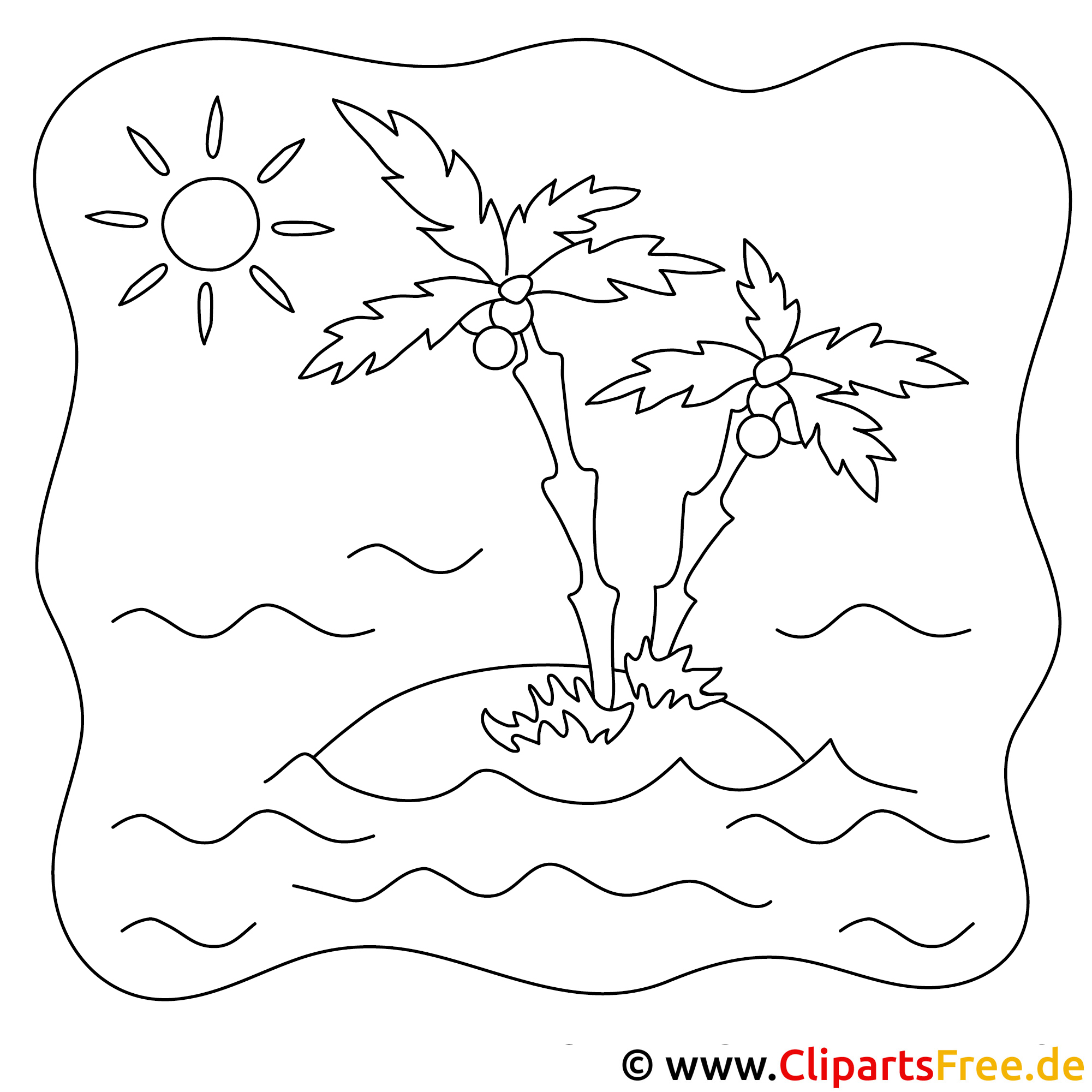 Stell dir vor, du bist an einem kleinen, einsamen Strand. Ja, genau – ein perfekt friedlicher Ort! Bei diesem Ausmalbild siehst du zwei Palmen, die entspannt auf einer kleinen Insel stehen. Die Sonne strahlt vom Himmel, elegant und freundlich, während die Wellen sanft ans Ufer plätschern. Das Motiv wirkt so angenehm, dass man fast den Duft von Meer und Sand riechen kann. tja, Ein Bild, das Sommerlaune verbreitet!