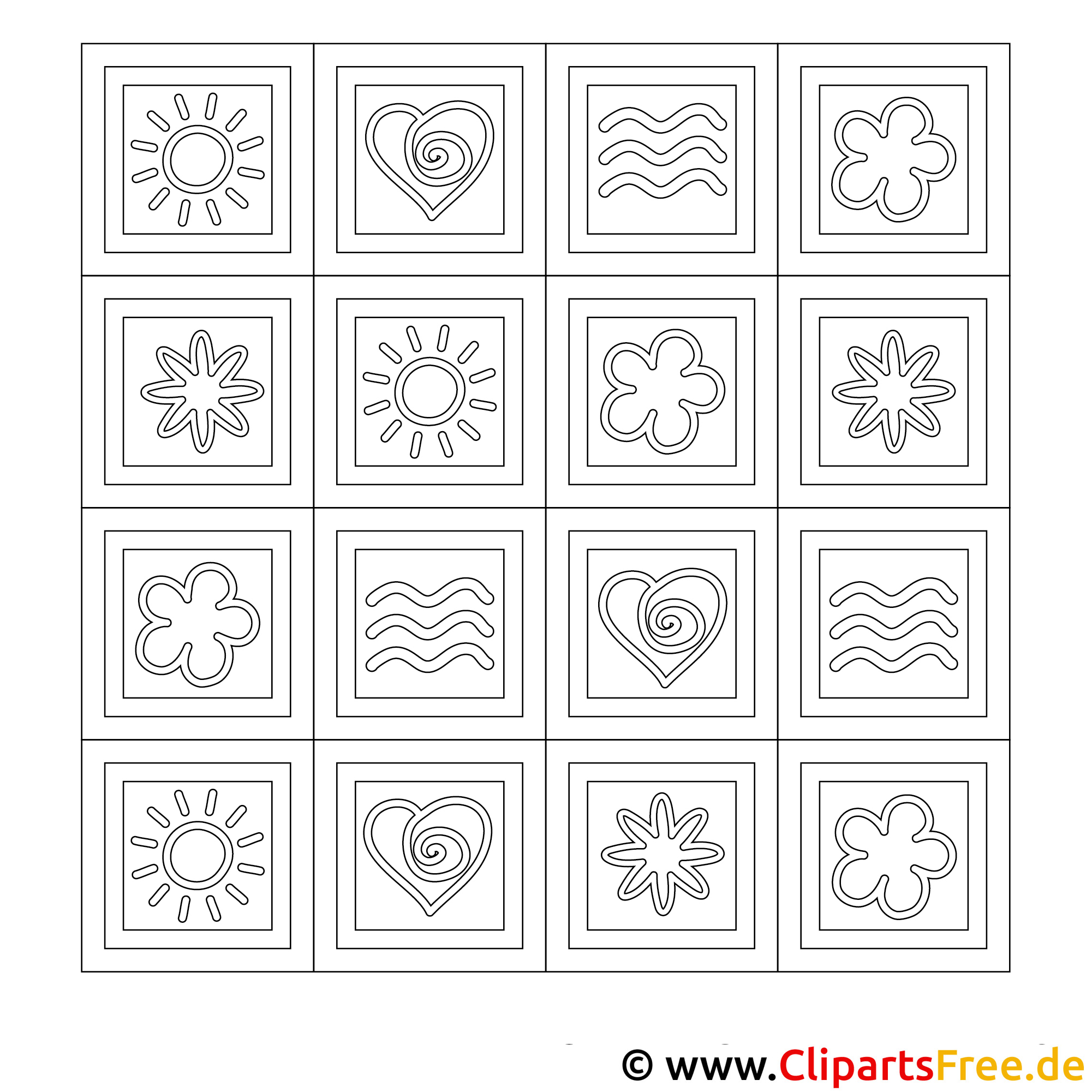 Das Bild zeigt eine aufregende Kombination von verschiedenen einfachen Motiven, schön angeordnet in einem 4x4-Raster. Hier finden wir Herzen, Sonnen, Blumen und einige gewellte Linien – wirklich fabelhaft! Jedes Element hat seinen eigenen Charme und wartet nur darauf, mit Farbe zum Leben erweckt zu werden. Die klare Struktur des Designs macht es einfach, kleine Details auszumalen.