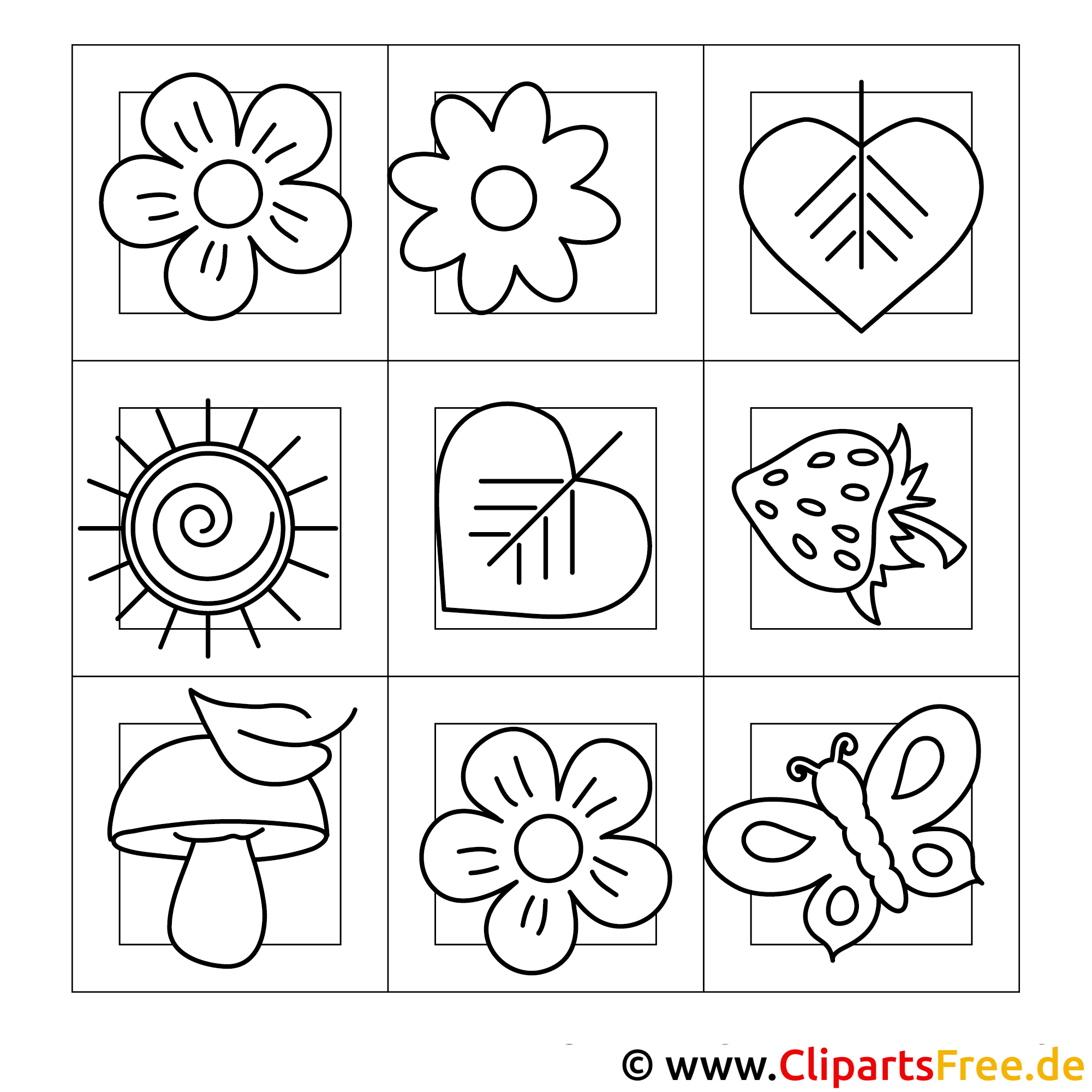 Schau dir dieses schöne Ausmalbild an! Es zeigt eine ganz bunte Mischung aus fröhlichen Motiven. In den verschiedenen Kästchen findet man Blumen, Herzen, Pilze und sogar einen Schmetterling. Und die Sonne, die strahlt ganz hell! Das Bild lädt richtig ein, kreativ zu werden. Man kann die einzelnen Elemente ganz nach Lust und Laune einfärben. Es gibt unzählige Möglichkeiten.