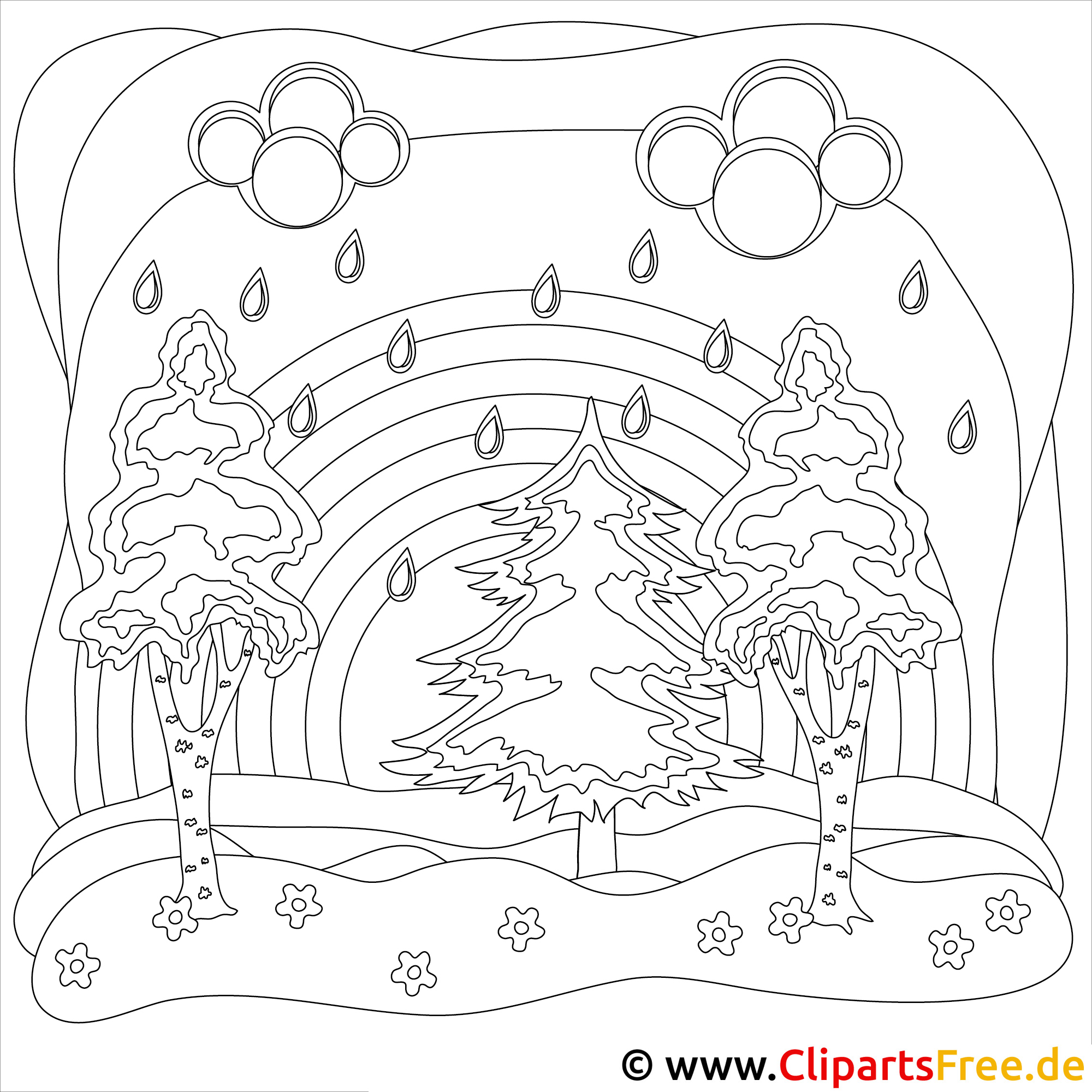 Kostenloses Ausmalbild mit Regenbogen und Bäumen als PDF