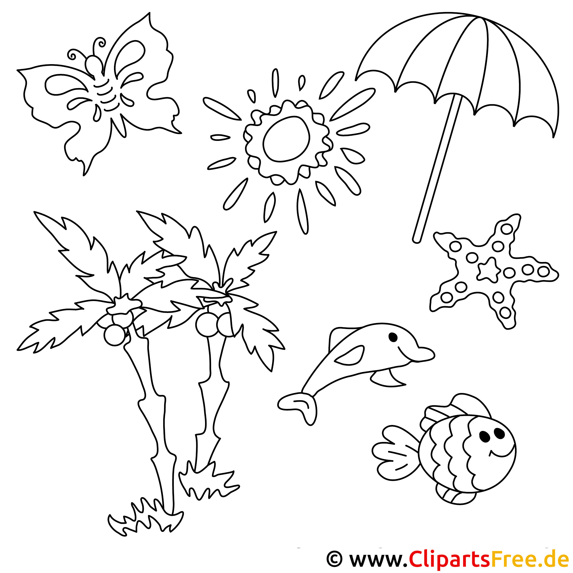 Hier haben wir eine fröhliche Szene, die gleich mehrere Sommermotive vereint! Ein bunter Schmetterling, der gleich seine Flügel ausbreitet, eine leuchtende Sonne, die für gute Laune sorgt, und eine lustige Palme, die im sanften Wind wiegt. Aber das ist noch nicht alles! Da sind auch ein Delfin, der verspielt durch die Wellen springt, ein fröhlicher Fisch und ein bunter Seestern, der am Strand liegt. Und natürlich darf ein Sonnenschirm nicht fehlen – praktisch, oder? Alle diese Elemente bieten eine ganz bunte Palette, die zum Ausmalen einlädt!