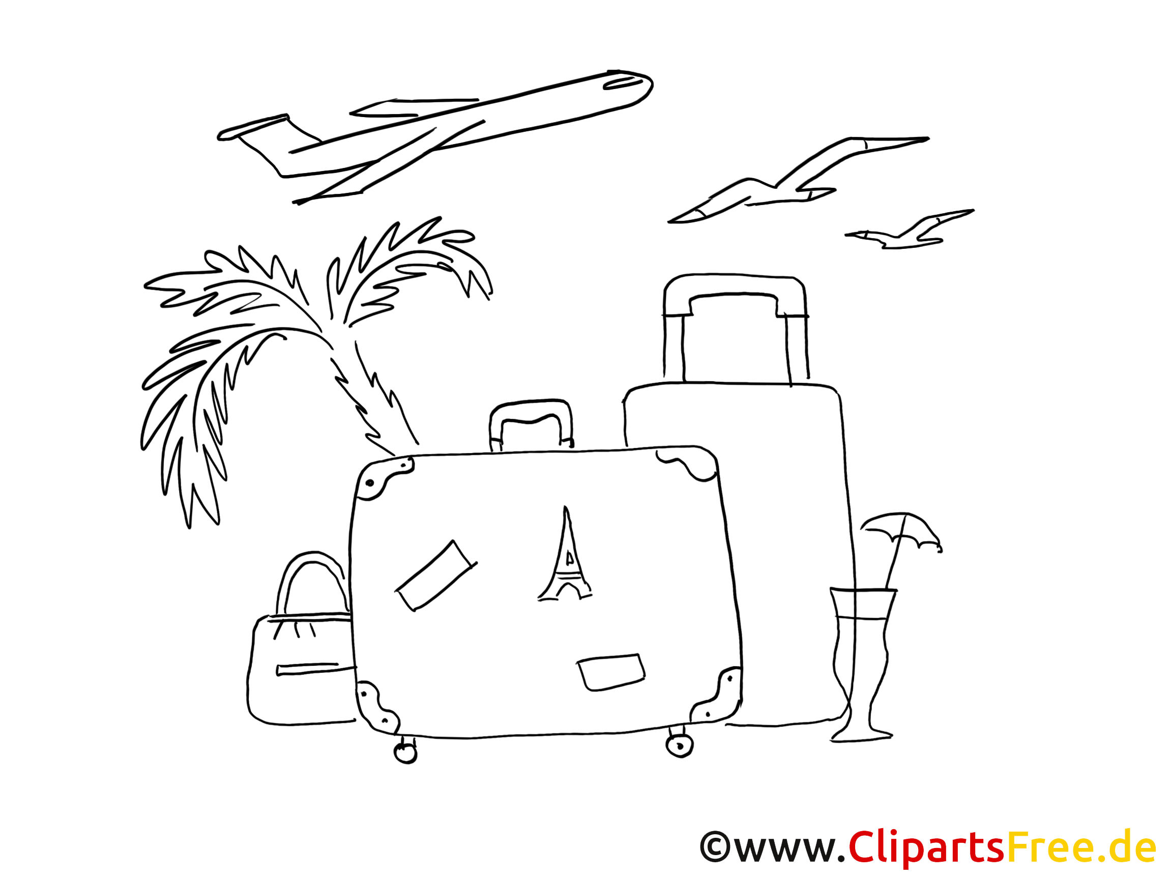 Stell dir vor, du bist im Urlaub! Genau das zeigt dieses schöne Ausmalbild – mit Koffern, einer Palme und sogar einem Flughafenflieger oben am Himmel. Die Koffer tragen Aufkleber von tollen Orten wie der Eiffelturm, was gleich Fernweh weckt, oder? Die Palme bringt gleich Urlaubsstimmung mit. Das Bild wirkt einladend und macht Lust darauf, mit Farben zu spielen.