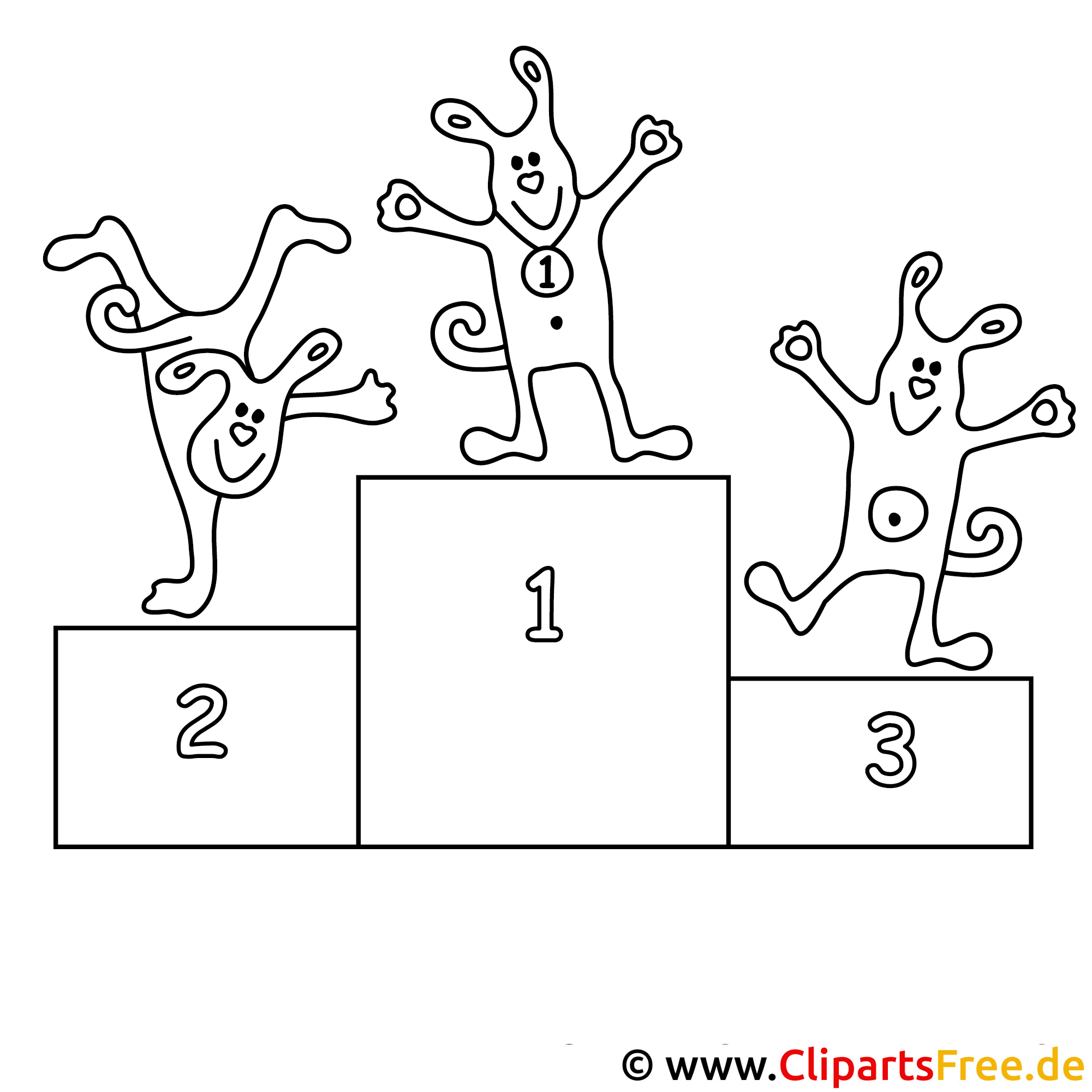 Auf dieser lustigen Malvorlage siehst du drei fröhliche Hunde auf einem Siegerpodest. Der erste Hund steht ganz stolz oben in der Mitte, während die anderen beiden auf den unteren Podesten stehen. Sie scheinen sich riesig zu freuen – vielleicht haben sie einen Wettlauf gewonnen? Die Hunde haben ein bisschen alberne, grinsende Gesichter und witzige hängende Ohren, die einfach gute Laune machen. Außerdem kannst du jederzeit kreativ werden und die Hunde bunt anmalen – welche Farben gefallen dir?