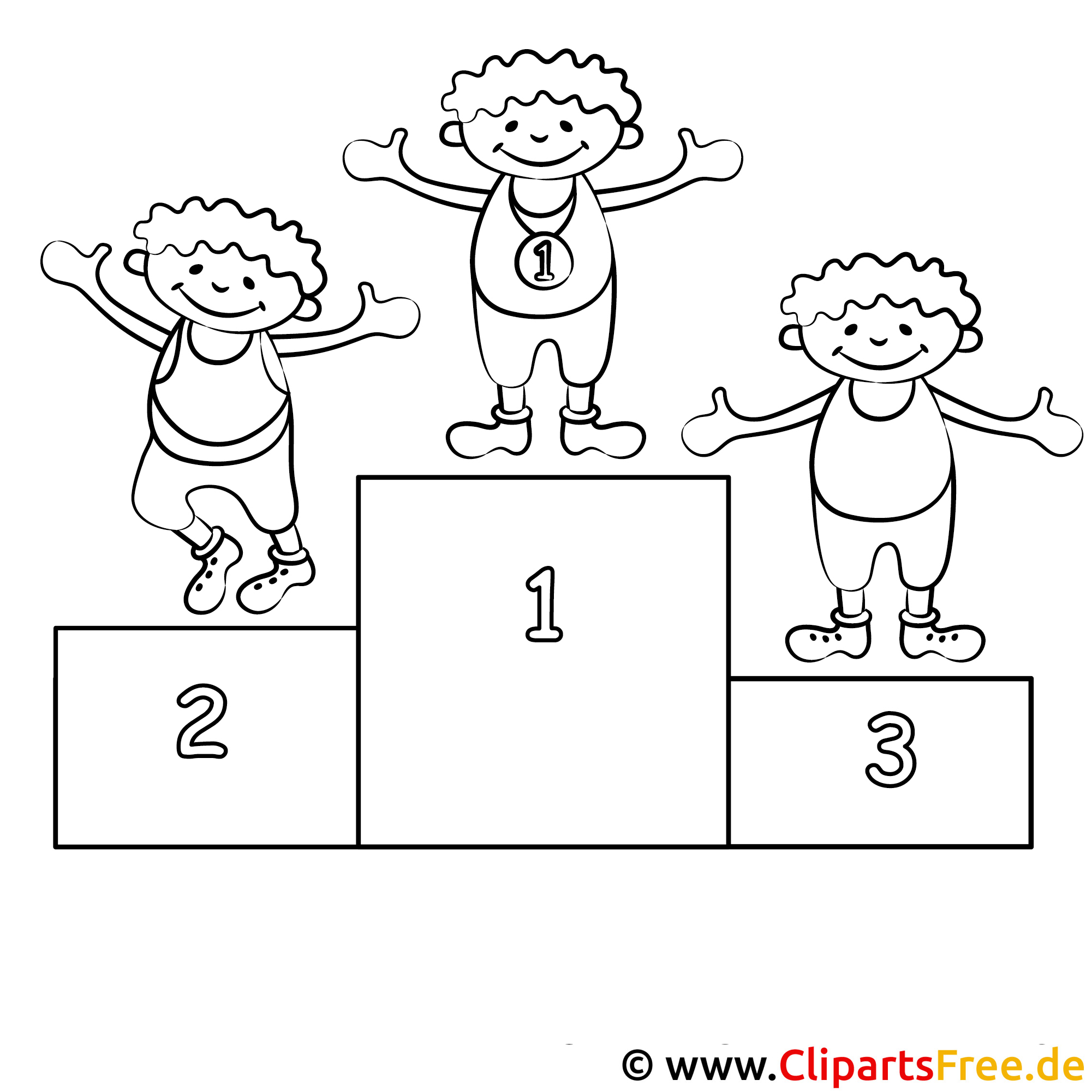 Das Bild zeigt drei fröhliche Kinder, die stolz auf einem Treppchen stehen. Die beiden anderen stehen rechts und links daneben, ihre Arme weit auseinander, als würden sie jubeln. Es gibt erkennbar einen klaren ersten Platz in der Mitte – der Sieger! Das Treppchen hat die Zahlen 1, 2 und 3. Diese Darstellung strahlt pure Freude und Kindheit aus. Ideal für ein Ausmalbild, das die kleinen Künstler auffordert, ihrer Kreativität freien Lauf zu lassen.