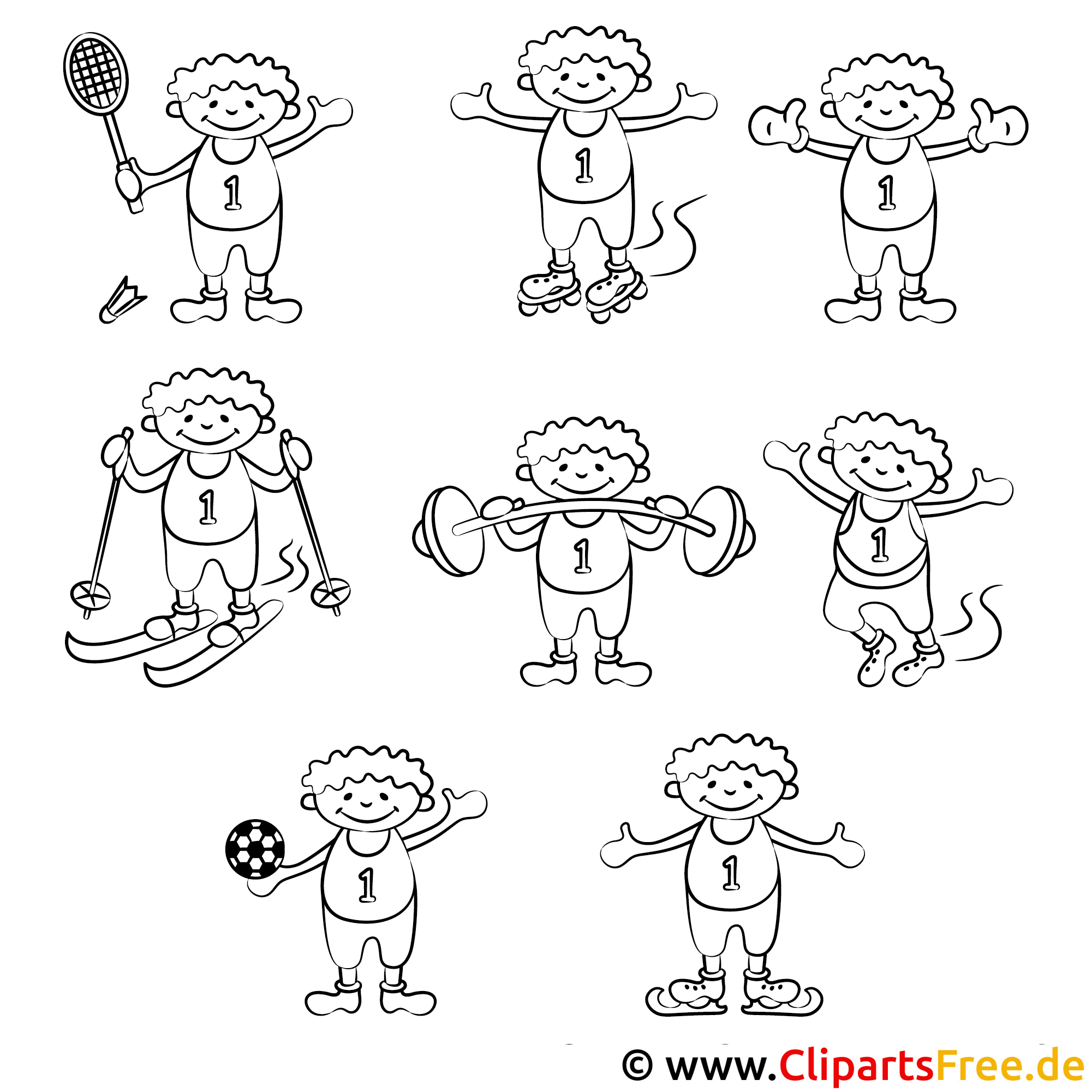 Auf dieser tollen Malvorlage siehst du verschiedene fröhliche Kinder, die unterschiedliche Sportarten ausüben. Manche haben Schläger, andere spielen Ball oder heben Gewichte. In verschiedenen Positionen und mit lebhaften Gesichtern zeigen sie eine Menge Spaß beim Sport. Jedes Kind hat eine eigene Pose, und das macht das Bild so lebendig! Besonders auffällig sind die kleinen Details, zum Beispiel die Schläger oder die Skier, die die Aktivitäten der Kinder perfekt unterstreichen.