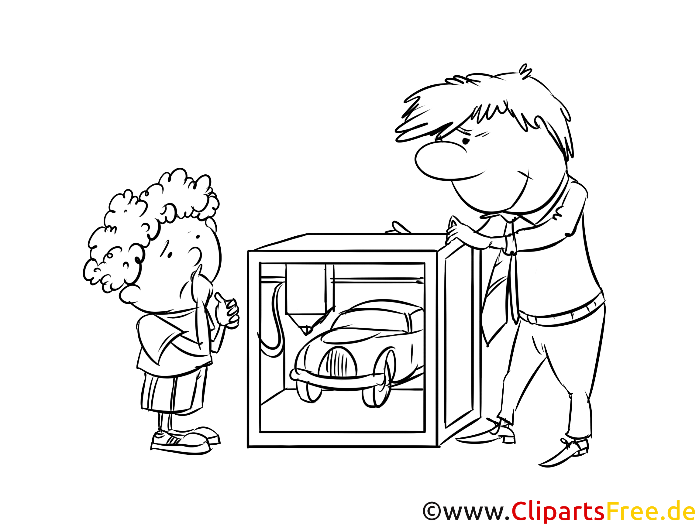 In diesem wunderbaren Ausmalbild sehen wir zwei fröhliche Figuren. Der Junge mit den lockigen Haaren, ehrlicherweise richtig süß, schaut gespannt auf einen gläsernen Kasten – und drinnen, wow, ein schickes Auto! Es macht wirklich Spaß zu sehen, wie die beiden aussehen. Der ältere Mann daneben, wahrscheinlich ein Pappa oder Onkel, grinst zufrieden. Seine Gesichtsausdrücke zeigen Freude und ein bisschen Stolz über das, was er da präsentiert. Diese Szene strahlt absolute Begeisterung aus und weckt die Fantasie–. Was könnte da alles passieren?