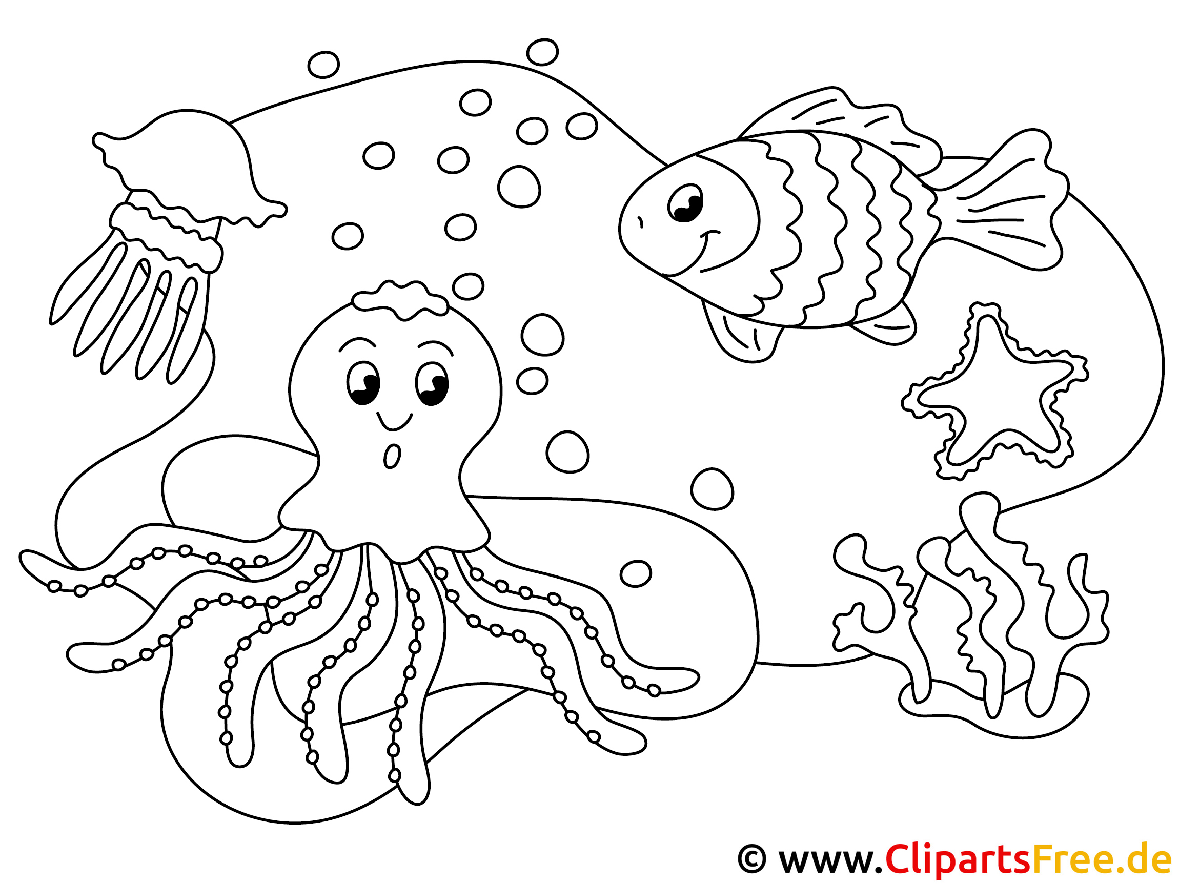 Stell dir ein fröhliches Meeresbild vor – da schwimmt ein netter kleiner Fisch mit großen Augen und einem sogar ein bisschen scherzhaften Grinsen. Direkt daneben, wow, da ist ein ganz süßer Octopus, der mit seinen vielen Armen spielerisch in der bunten Unterwasserwelt herumschwirrt. Das Bild ist voller Möglichkeiten! Ein paar Luftblasen, die munter aufsteigen, machen die Szene lebendig. Und auch die Quallen? Ja, two. Die sehen einfach toll aus, mit ihren transparenten Körpern. Es gibt Korallen und einen kleinen Stern, was man ebenfalls super anmalen kann.