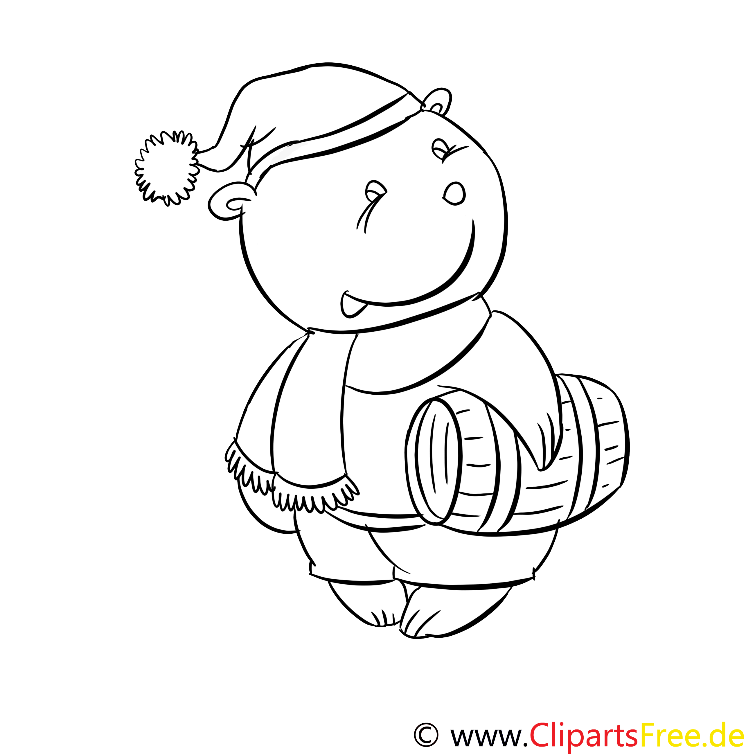 Das Ausmalbild zeigt einen putzigen, freundlichen Bären, der in einem lustigen Weihnachtsmütze steckt. Mit einem breiten Lächeln auf dem Gesicht scheint er richtig gut gelaunt zu sein. Um seinen Hals trägt er einen warmen Schal, und in seinen Pfoten hält er einen großen, rustikalen Holzfass. Vielleicht bereitet er sich auf eine festliche Überraschung vor oder bringt etwas Leckeres! Die Linien sind klar und einladend, perfekt für kleine Künstler.