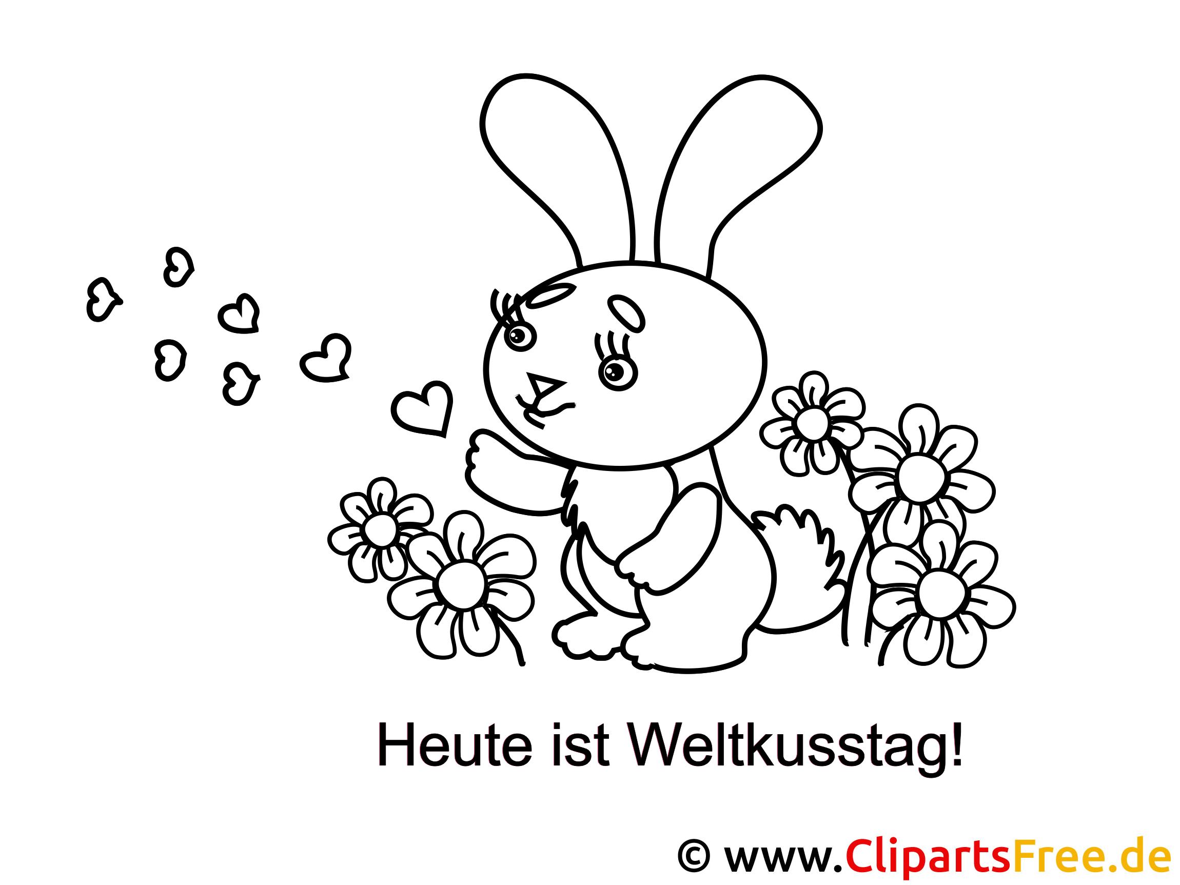 Hier haben wir ein ganz besonderes Ausmalbild! Ein niedliches, fröhliches Kaninchen, das in einer Blumenwiese sitzt. Es blinzelt mit seinen großen, glitzernden Augen und pustet kleine, herzförmige Küsschen in die Luft. Die bunten Blumen um das Häschen herum wirken einladend und fröhlich. Süß, oder? Und noch besser: Die Aufschrift verkündet, dass heute Weltkusstag ist! Das bringt sofort gute Stimmung!