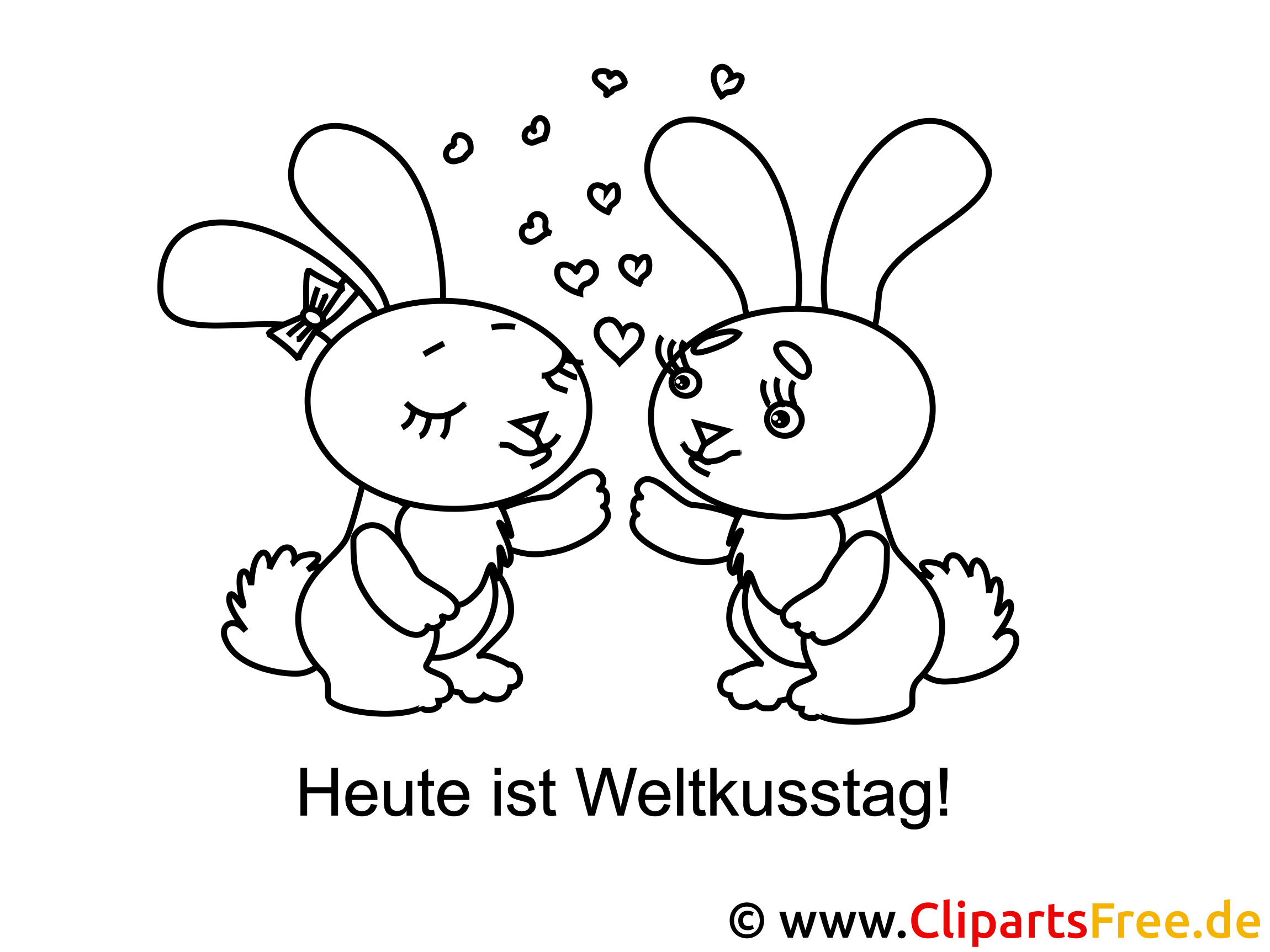 Oh, das Bild zeigt zwei süße Hasen! Sie stehen sich gegenüber und sind total vertieft in ihre Zuneigung. Die eine Hase hat eine kleine Schleife im Ohr – so niedlich! Über ihnen fliegen kleine Herzchen, die die Liebe ins Bild bringen. Es scheint, als ob sie gerade einen Kuss austauschen. Wirklich herzerwärmend, oder? Und dazu steht noch „Heute ist Weltkusstag!“. sozusagen, Ein toller Anlass zum Ausmalen und Spaß haben!