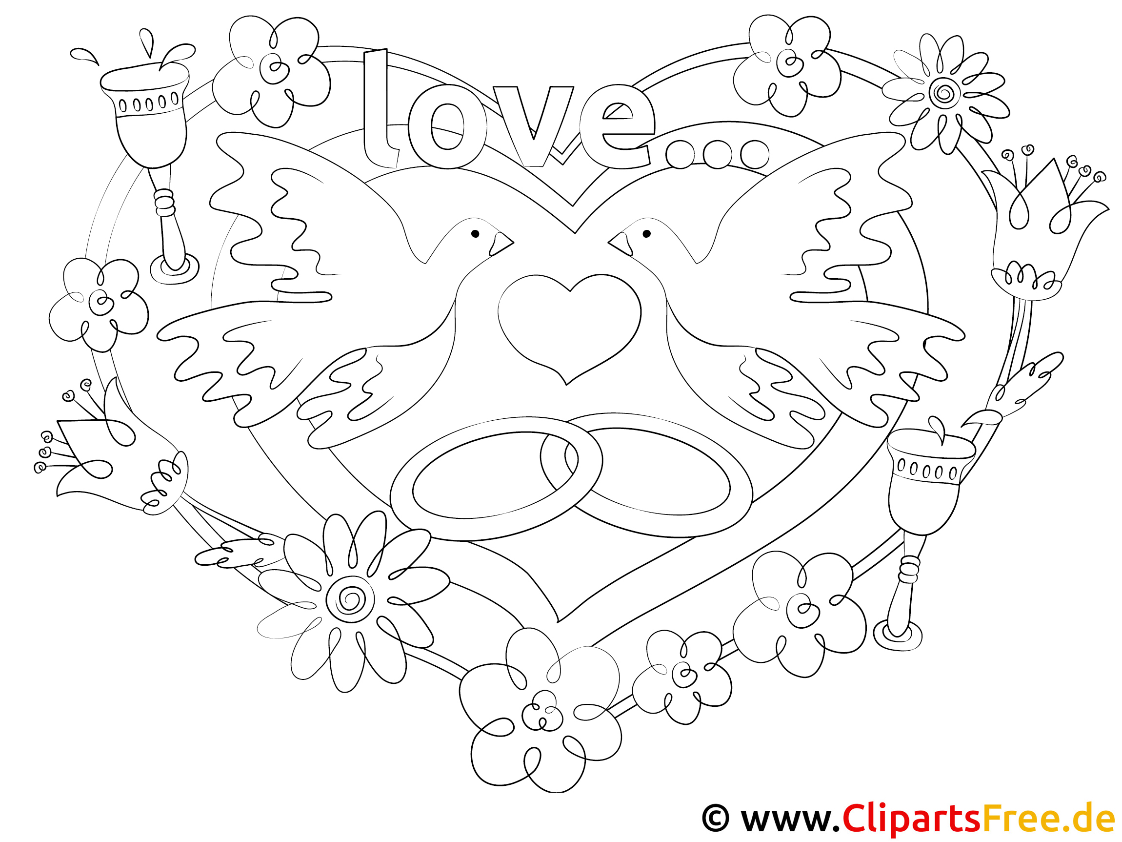 Das Ausmalbild zeigt ein romantisches Motiv, das zwei Tauben inmitten eines großen Herzens darstellt. Diese Tauben, sie schauen sich an, wirken ganz friedlich und harmonisch. Um sie herum sind noch hübsche Blumen, die das ganze Bild lebendiger machen. Man sieht auch Ringe, die symbolisch für die Liebe stehen – ja, es hat etwas mit Hochzeit zu tun! Darüber steht groß und einladend das Wort „love“, ein absoluter Klassiker. Die Kombination der Elemente vermittelt eine fröhliche und liebevolle Botschaft. halt, Man merkt gleich, dass dies ein Bild für spezielle Anlässe ist, vielleicht für einen Valentinstag oder eine Hochzeit!