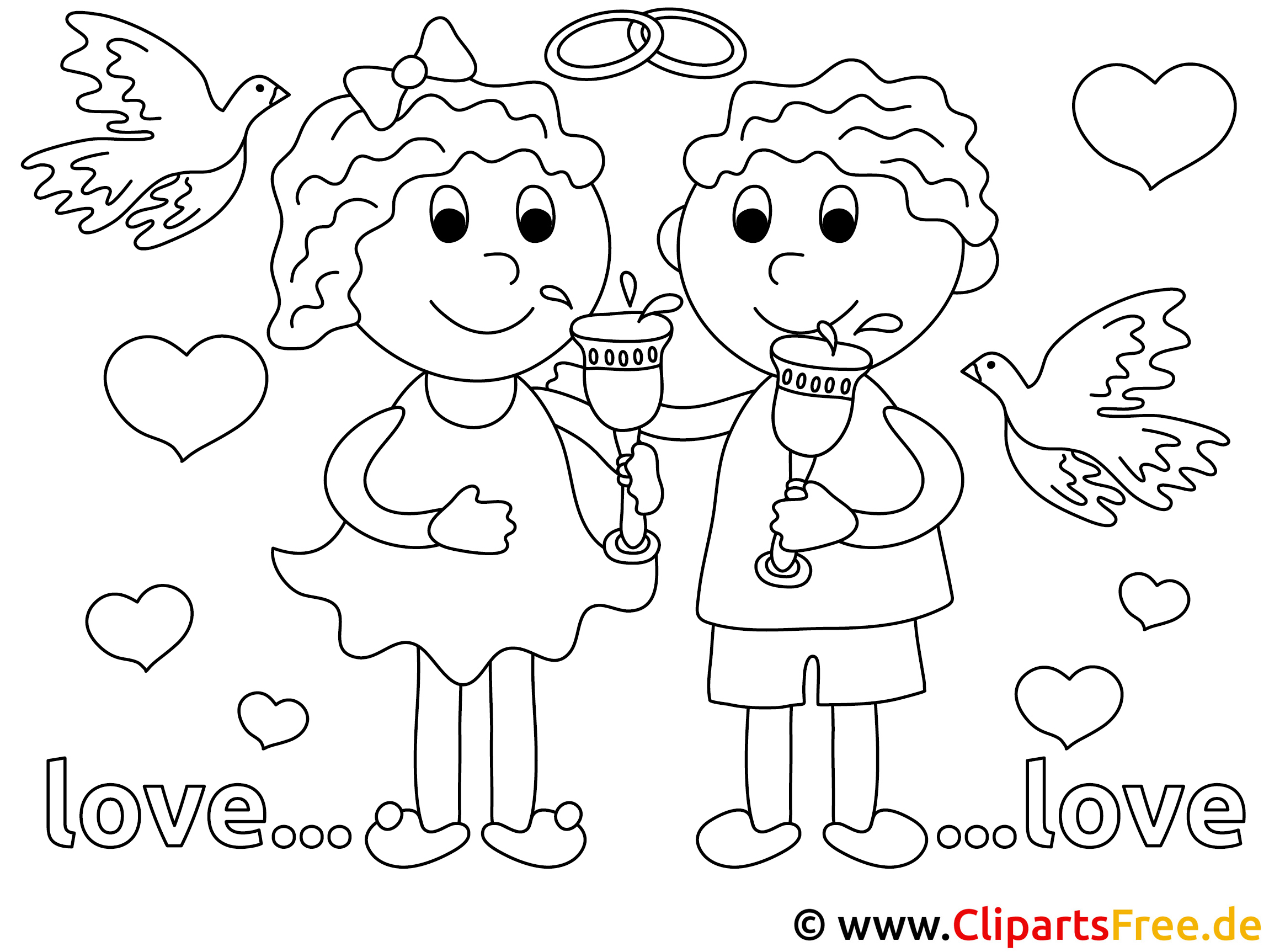 Hier haben wir ein ganz zauberhaftes Ausmalbild, das ein fröhliches Pärchen zeigt. Sie feiern, wahrscheinlich den Valentinstag oder einen anderen besonderen Moment! Die beiden stehen mit Gläsern in der Hand und lächeln sich strahlend an. Im Hintergrund sind süße Tauben und Herzen, die die schöne Stimmung noch unterstreichen. Besonders die Details, wie die Ringe über den Köpfen, setzen dem Ganzen die Krone auf. Diese Malvorlage ist wie dafür gemacht, um jeder Feier etwas Farbe und Freude zu verleihen!