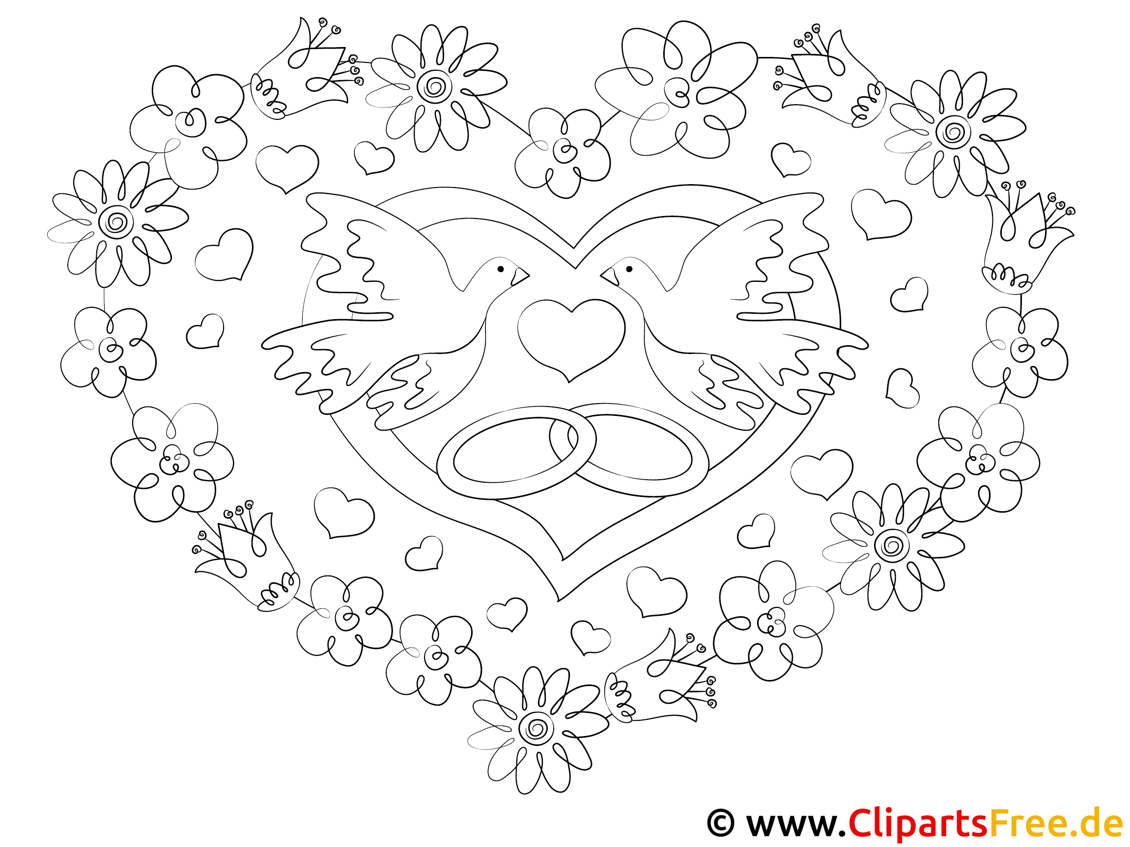 Hier haben wir ein wunderschönes Ausmalbild, das ein herzförmiges Motiv präsentiert. Im Inneren des Herzens fliegen zwei zarte Tauben – einfach süß, oder? Überhaupt, die Tauben, die zum Symbol der Liebe gelten, schauen so harmonisch aus. Darum sind sie gemeinsam mit einer kleinen, romantischen Herzform platziert. Und schaut mal, die Eheringe sind auch da, genau in der Mitte. also, Alles umgeben von eine Menge bunter Blumen und kleinen Herzen. Das ist nicht nur hübsch anzusehen, sondern auch passend für viele Anlässe – Hochzeit, Valentinstag oder einfach so!