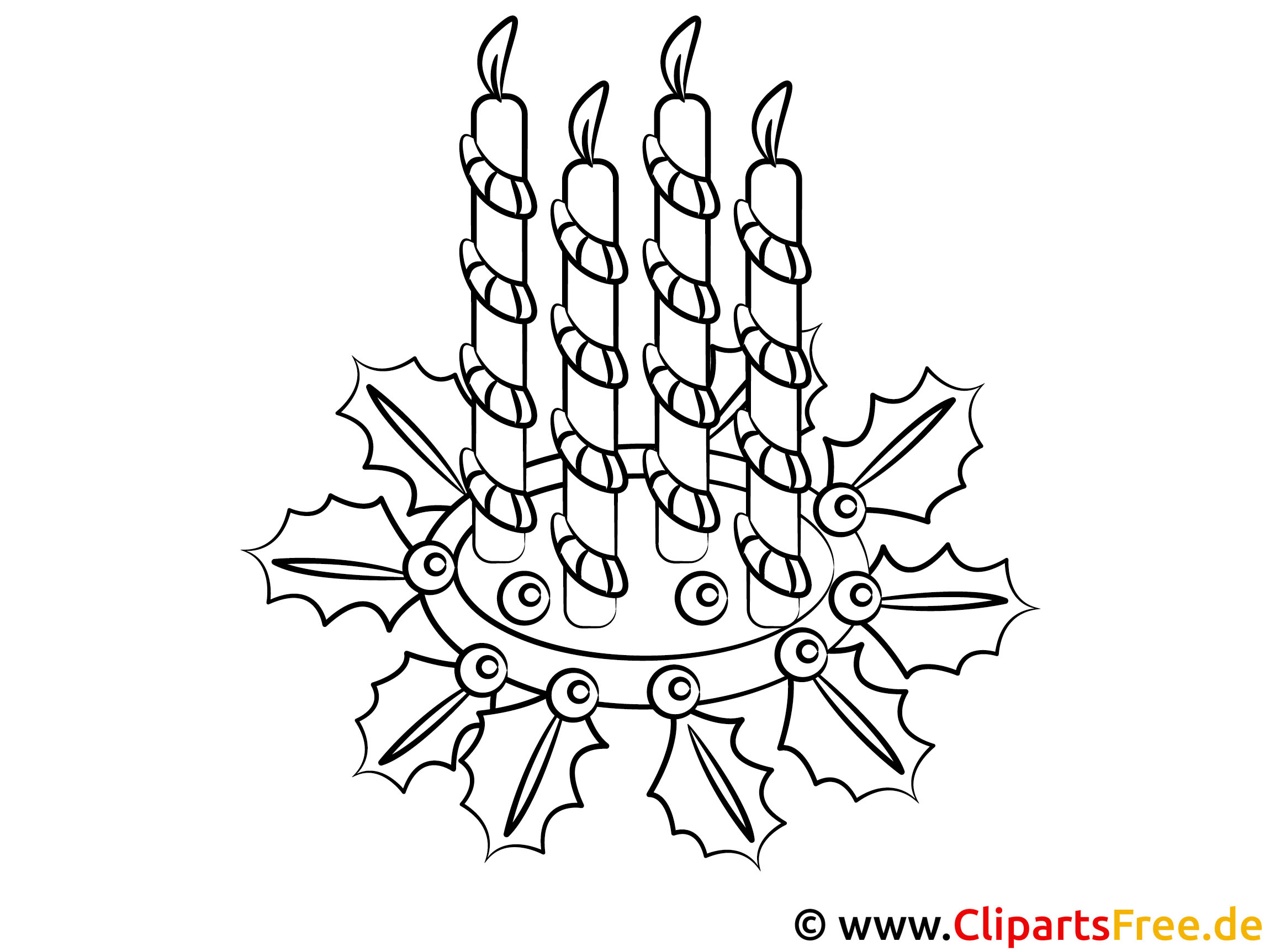 Hier haben wir ein hübsches Bild zum Ausmalen – klar, etwas weihnachtlich, oder? Es zeigt einen Adventskranz mit vier Kerzen, die gleich in einem warmen Licht erstrahlen könnten. Rund um die Kerzen schmücken grüne Blätter den Kranz. Ein schönes Detail! Die Kerzen sind spiralförmig gedreht, und das hat was, finde ich. Eine kreative Malvorlage, die nicht nur Kinder, sondern auch Erwachsene inspirieren kann.