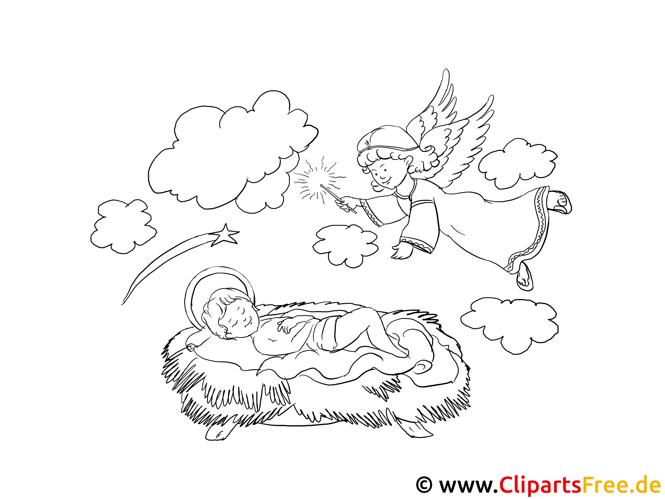 In dieser zauberhaften Malvorlage sehen wir eine friedliche Szene. Ein kleiner Engel schwebt durch die Luft, ganz sachte und voller Freude. Er hat große, flauschige Flügel und schaut liebevoll auf das neugeborene Kind, das in einer gemütlichen Krippe schläft. Rundherum sind ein paar Wolken und ein schöner Stern, der leuchtet und strahlt. Diese friedvolle Komposition vermittelt ein Gefühl von Ruhe und Geborgenheit – perfekt für die Advents- und Weihnachtszeit.