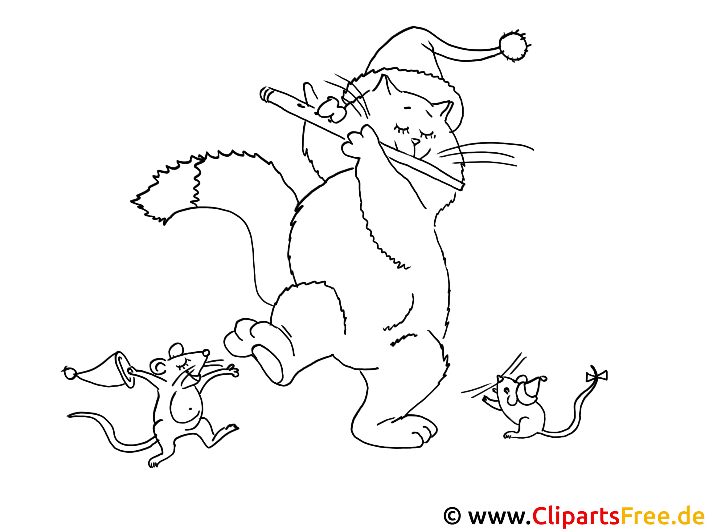 Das Bild zeigt eine lustige Szene, die direkt ins Herz geht. Eine fette, fröhliche Katze trägt ja, ihr wisst schon, diesen typischen Weihnachtsmann-Hut und spielt auf einer Flöte. Und daneben, da sind zwei kleine Mäuse, die ganz begeistert tanzen! Oh, wie süß! Ihre kleinen Hüte wackeln beim Tanzen, und sie scheinen ganz verzaubert von der Musik. Es ist, als würde die ganze Atmosphäre vor Freude sprühen! Ein richtig schönes Bild zum Ausmalen, oder?