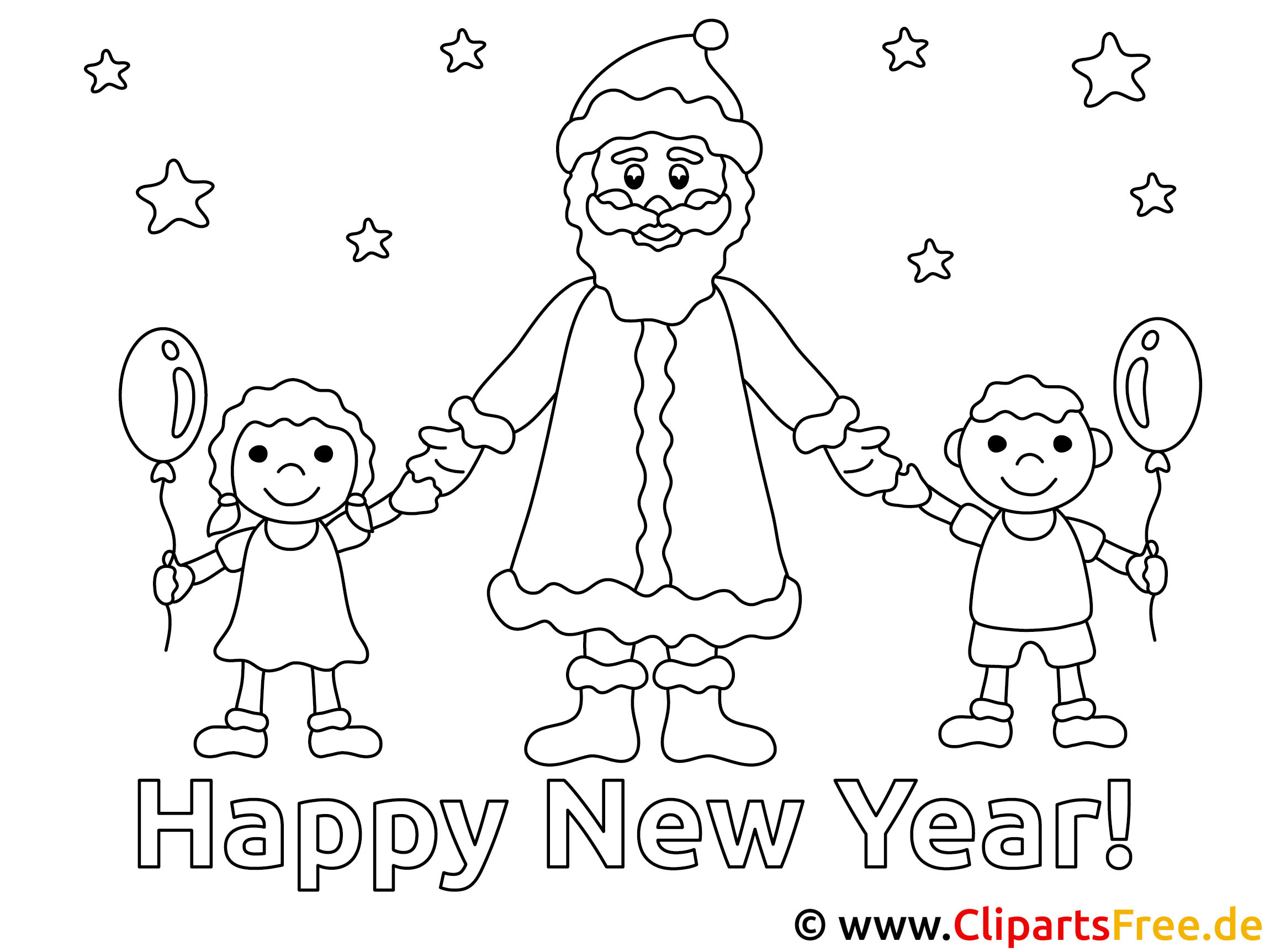 Das Ausmalbild zeigt eine fröhliche Szene, die perfekt zum Jahreswechsel passt! In der Mitte steht ein Weihnachtsmann mit einem großen, lächelnden Gesicht und einem schneeweißen Bart. Er wirkt richtig einladend. Auf beiden Seiten hält er die Hände von zwei Kindern. Die Jungs haben bunte Luftballons, feiern ordentlich mit und strahlen vor Freude. Über ihnen sind funkelnde Sterne und der Schriftzug „Happy New Year!“ in großen, fetten Buchstaben. Ein absolut fröhliches Bild, das sofort gute Laune macht!