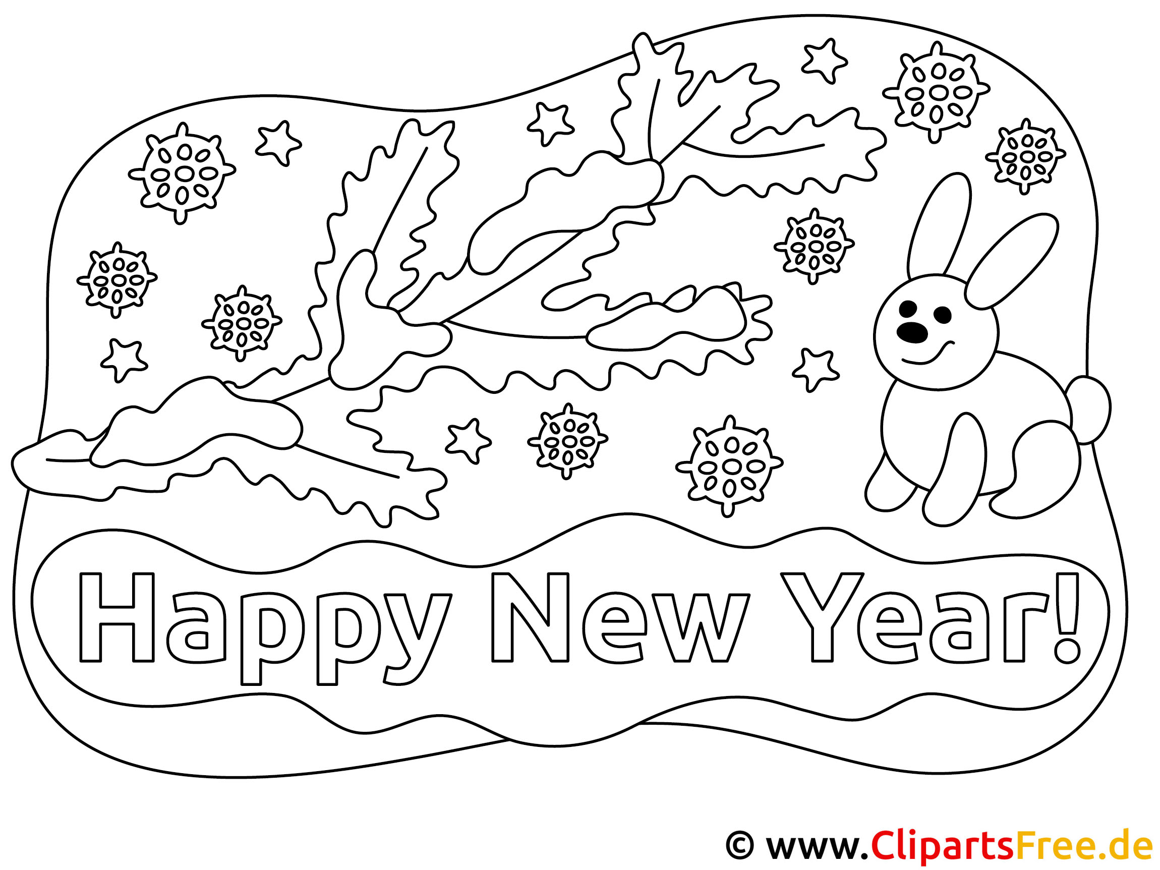 Hier sehen wir ein fröhliches Ausmalbild zum Thema Neujahr! Ziemlich niedlich, oder? Ein putziger Hase lächelt uns an und sitzt, betont von einer harmonischen Hintergrundszene, umgeben von einigen geschneiten Zweigen und lustigen Schneeflocken. Darüber prangt der Schriftzug „Happy New Year!“. So bringt das Motiv ganz sicher gute Laune und bereitet Freude – nicht nur den Kleinen, sondern auch den Großen, die beim Ausmalen helfen. Man könnte direkt Lust bekommen, die Farben herauszuholen und kreativ zu werden!
