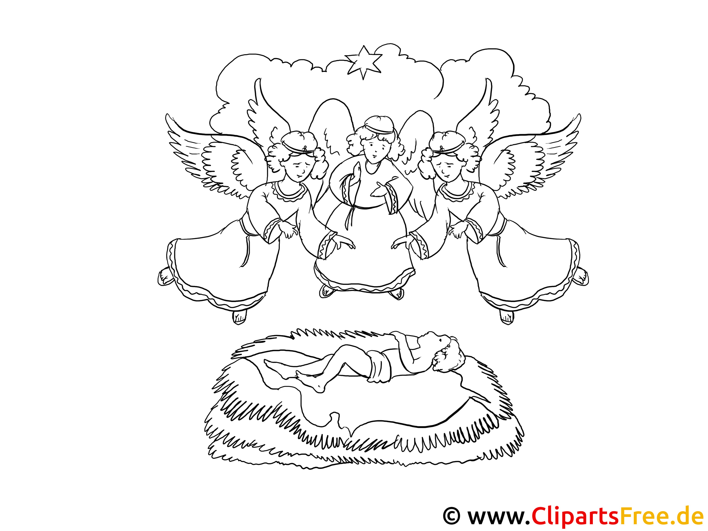 Das Motiv zeigt eine wunderschöne Weihnachtsgeschichte. In der Mitte liegt ein kleines Kind, umhüllt von einer warmen Decke auf Heu. Darüber schweben drei Engel, jeden besonders hübsch und strahlend. Die Engel scheinen voller Freude zu sein, als würden sie einen ganz speziellen Moment feiern. Sie werfen sanfte Blicke auf das Kind, das in eine Art Tuch gehüllt ist. Über allem leuchtet ein funkelnder Stern am Himmel, was dem Bild eine besondere Feierlichkeit verleiht. Ein wunderschönes Bild, das einfach zum Ausmalen einlädt!