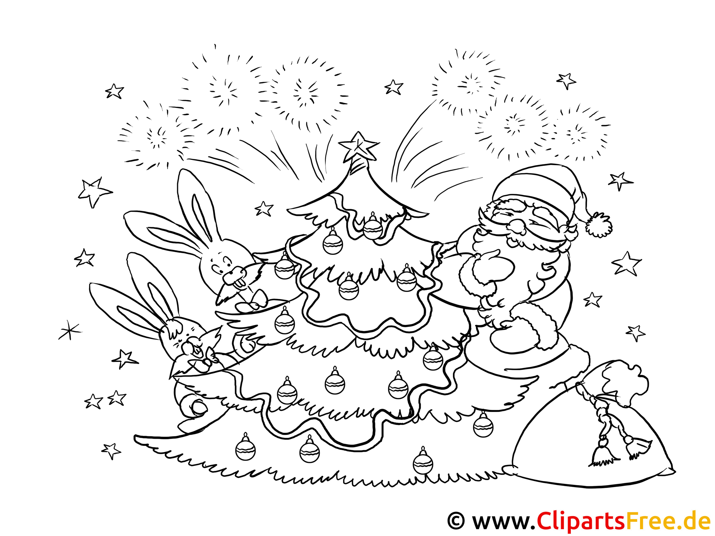 Stell dir vor, es ist Weihnachten! Schnee fällt leise und die Vorfreude ist spürbar. Auf dem Bild siehst du einen fröhlichen Weihnachtsmann, der gerade mit einigen kleinen, flinkigen Hasen einen Weihnachtsbaum schmückt. Der Baum ist festlich geschmückt, ganz oben strahlt ein goldener Stern, und aus der Baumspitze funkeln bunte Lichter. Die Hasen, voller Energie, genießen es sichtlich, sie probieren sogar, die Baumkugeln aufzuhängen. Im Hintergrund erleuchten strahlende Feuerwerke den Nachthimmel und zwei kleine Sterne blitzen hervor. Es ist einfach zauberhaft!