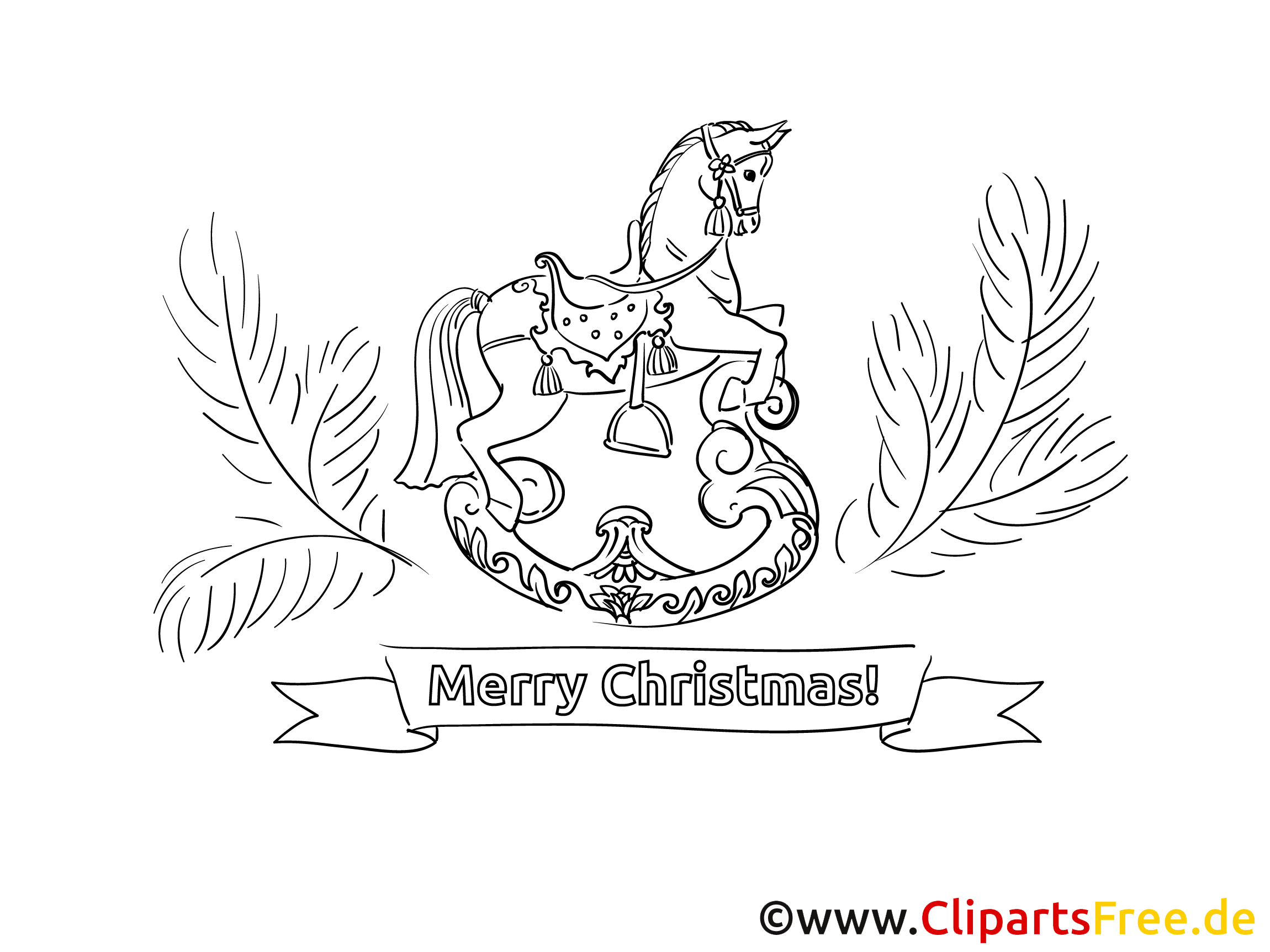 Das Bild zeigt ein wunderschönes Schaukelpferd, das liebevoll gestaltet ist. Es hat eine glänzende Mähne, ein hübsches Geschirr und kleine Glöckchen, die daran baumeln. Besonders auffällig ist die verschnörkelte Holzoptik, die dem Ganzen ein nostalgisches Flair verleiht. Um das Pferd herum ist eine üppige folkloristische Verzierung, die es noch festlicher erscheinen lässt. „Merry Christmas!“ prangt auf einem Band unter dem Schaukelpferd … . Die Kombination aus verschnörkelten Elementen und dem klaren Schriftzug macht das Bild einfach zeitlos und passend für viele Gelegenheiten!