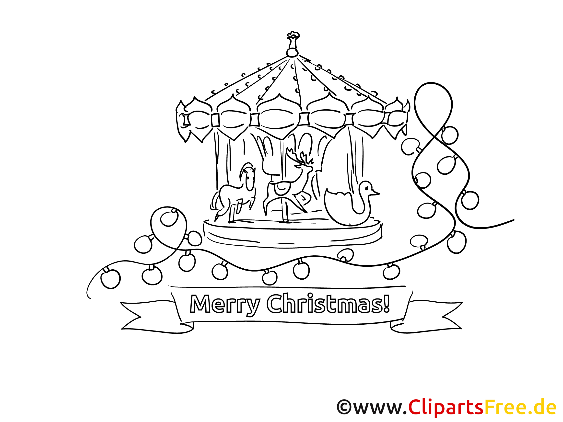 Die Malvorlage zeigt einen wunderschönen Jahrmarkt. Ein bunter Karussell mit hübschen, geschmückten Pferden und einem Entchen zieht sofort die Blicke auf sich. Das Dach des Karussells ist mit vielen kleinen Lichtern dekoriert, die zum Schwingen anregen. Und hey, „Merry Christmas!“ prangt in einer geschwungenen Schrift auf einem Banner, das den bunten Bildrahmen vervollständigt. Die ganzen Details laden dazu ein, das Bild in den schönsten Farben auszumalen. Ehrlich gesagt, Kinder lieben solche Motive, da sie viel Raum für Kreativität bieten.